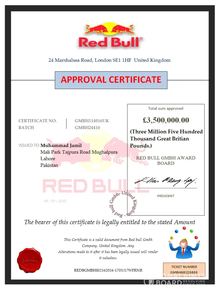 in conjunction with the British Tobacco WorldWide Promotion, your email was among the 12 Lucky winners who won a Cheque of 500, 000.00 GBP each on the RedBull Company Promotion.