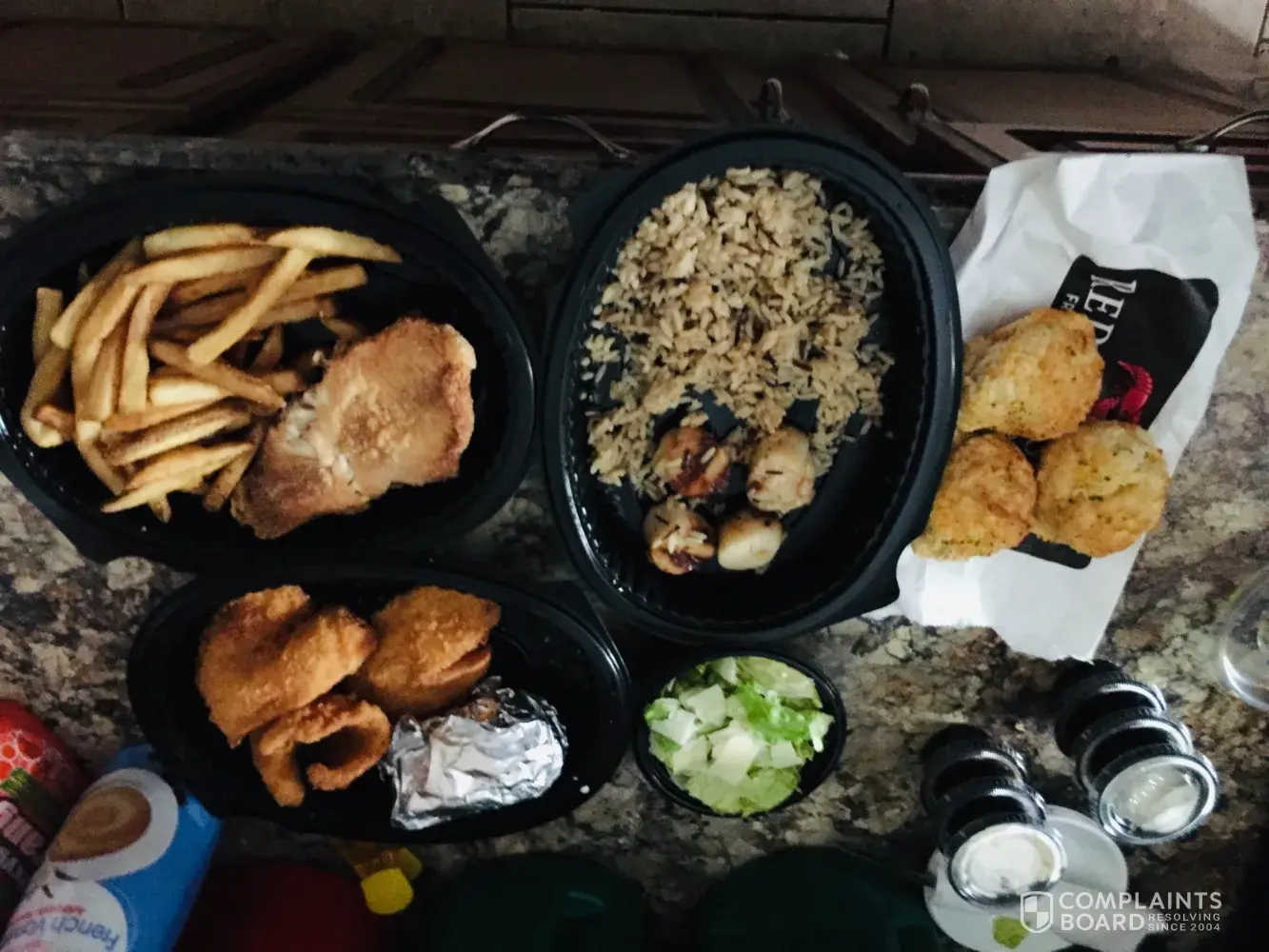 placed take out order #[protected] on 12 oct 2018 as had received gift card from my daughter for my birthday which was 13 oct 2018. used online ordering and ordered. said would be ready at 2:15pm so drove to town 12 miles away arrived approximately 2:30pm to pick up and pulled into pick up spot. no one comes with food so enter restaurant as does a woman behind me. see one waitress waiting on several tables. she tries to help and goes back to kitchen to tell them after looking at my order number. several minutes pass. waitress comes back and asked if they brought my order. told her nope. she seats other woman and again goes to back to advise still waiting for order. several more minutes pass. finally someone comes out asked order number again and went back to kitchen. more minutes tick by and she comes out with bag and says that will be $101 something dollars. advise my order is for $33 something. she goes back to kitchen again. I am not happy. more minutes go by. brings out my order looking like it was thrown in the bag. whatever- I am ready to leave this place. she says that is $28 something. told her my order said $33 something when placed order. and you know ... are they sure it's my order. she says again $28 something. OK then try to give her $30.00 gift card from daughter. she says I need to pay cash. told her was using gift card. then she says machine not working to verify card. asked if they could not call to verify amount. told no but said I could speak to manager. reintegrated I was not paying cash for order and they needed to accept card or keep the order. she went to back again. returned after several more minutes and stated manager would accept gift card only because it had not been removed from its "packaging" (so guess was good my daughter had written on it from mita to mom $30.00.) oh and they can not give me any change back. told them to give the change to the waitress who tried to help and left. by now it was pretty close to 2pm. got the order home and unpacked food. there was one tiny container of lettuce with about 3 slivers of cheese on it and that was my ceasar salad and there was only 1 of them and not the two ordered. there was no ceasar dressing as for some unknown reason was given 2 dressing size containers containing coleslaw which was never ordered. my flounder had 3 or 4 fish fingers and a baked potato that looked and tasted like it was leftover from the previous day with wrinkled hard skin. the catfish consisted of 1 small piece of fish with plenty of fries. there was a container a ketchup but no tarter or cocktail sauce sent along. received four very small sea scallops along with a bunch of wild rice. never ordered any wild rice or rice of any kind. this is the very worst experience that I have ever had at any red lobster restaurant that I have ever been to. if we ever go to a red lobster again it will not be the one in lake city.