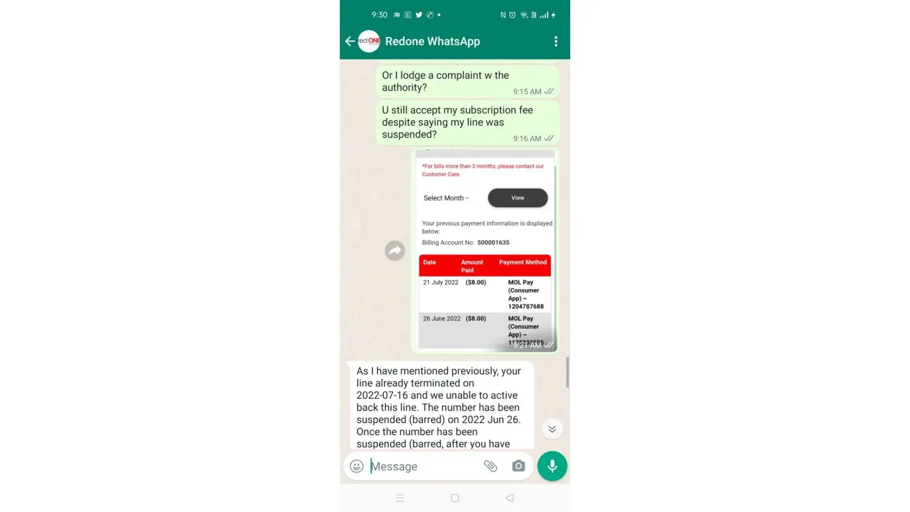 I'm very sad with redone service. I terminated my line on Sept 2019. However, the agent did not terminated my number and sadly, he used my line number without my permission. For next month, I received message from red one about payment I need to pay (RM180). After I settle made the payment, again, I received phone called from redone center that I have another balance amount that I need to pay RM150. What's this? I already made payment, RM180, amount that I didn't used and today, I need add another billing for RM150. I hope you can help me. My line number is [protected]