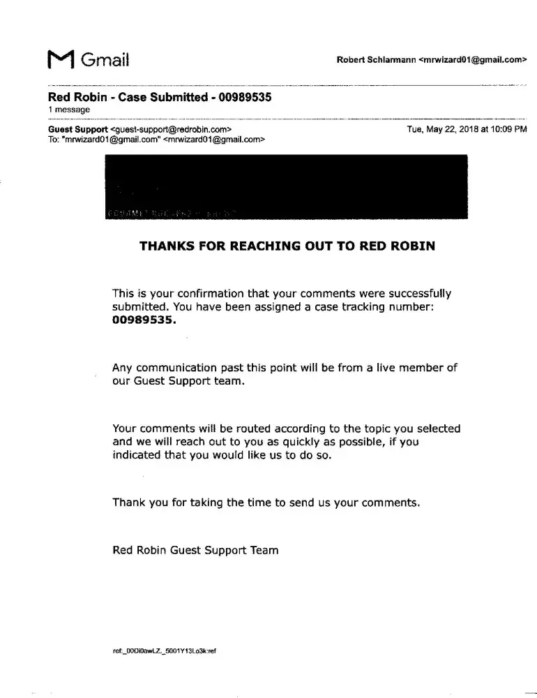 You can contact Red Robin Corporate on Facebook, Twitter or instagram. You can also go to their website, click on HELP and then on Restaurant Feedback.