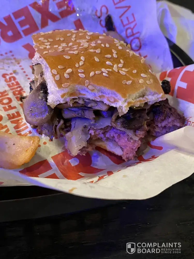 Order # [protected] online order I specifically asked for my burger to be well done which it was not it was pink. I do not eat under cooked meat! I also put in the special instructions since I was ordering 2 of the same type of burger that I wanted one with fries and one with chips. All the burgers came with fires and on top of my order was a sticker that...