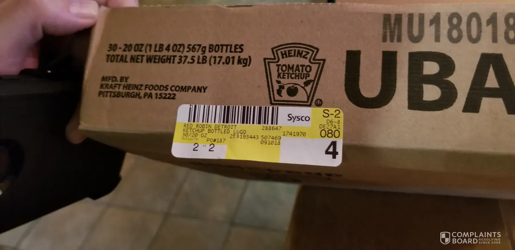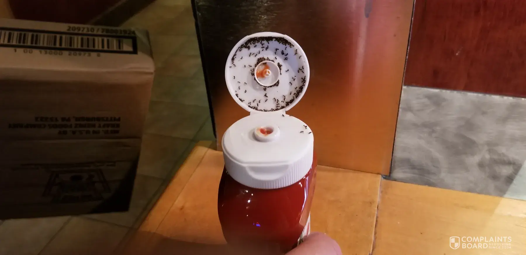 On September 10th of this year at around 5pm, I treated my bonus son and family to a Red Robin's meal for his birthday. We went to the Red Robin's located at 18650 Ford Rd. in Detroit (Dearborn) Michigan. While everyone was eating I had a ketchup bottle I used for my fries and I proceeded to eat. After I finished my fries I continued to use the ketchup for my burger and began eating it. One of the kids at the table wanted some of the ketchup I was using and when their mom took the bottle I was using and looked into the cap, she looked disgusted and showed it to the waiter and just said "dead ants!" The waiter also looked disgusted and I immediately left the table and went to the restroom and began throwing up. It was a terrible experience and I have yet to get a valid explanation from management. They went on to blame the manufacturing company and have not giving me any information to help me find out what I need to do to deal with this traumatic experience. I can't get the incident out my mind and it has definitely changed my appetite for burgers and restaurants. The manager let me take pictures of the cap and the number on the cap as well as the case he said it came out of but that has gotten me nothing. No explanation to why or who is responsible for this nasty experience I had at the restaurant.