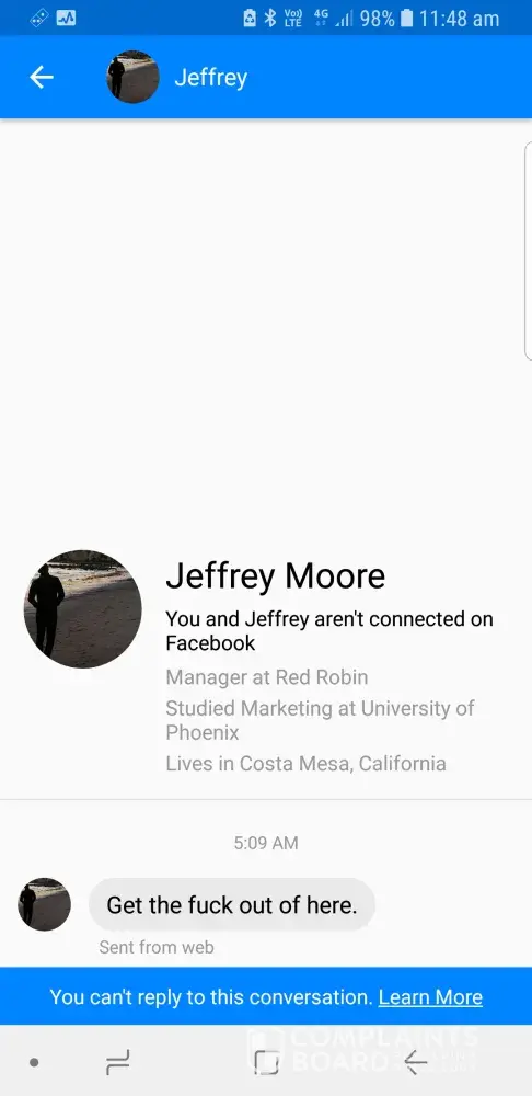 I received an abusive email from a manager of Red Robin named Jeffrey Moore. I have never contacted or spoken to this person so have no idea why I received this email. I think the person should be disciplined and replaced by head office of Red Robin.