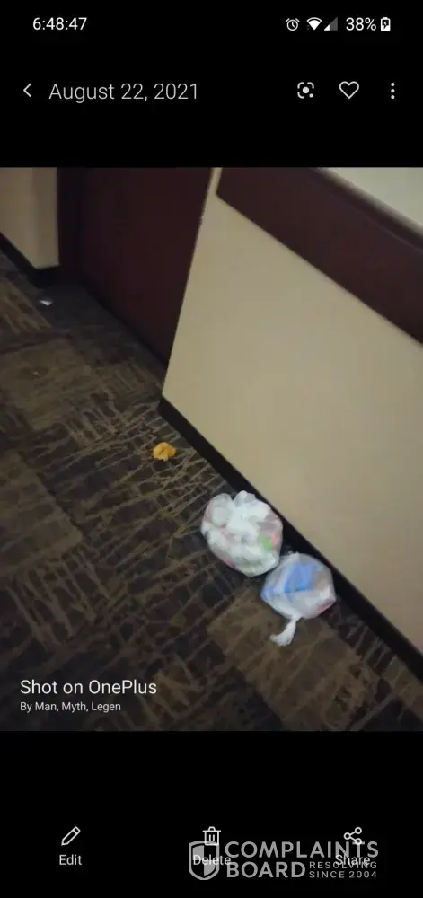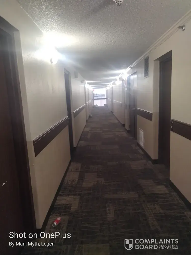 There was trash piled in the hallways, my bed didn't have pillows on it my room phone did not work the TV remote did not work. There's a lampshade missing off the lamp by the beds the bathroom lights did not work it was completely dark and wasn't able to see. There were no towels in my room I asked the front desk for towels and she stated that they did not...