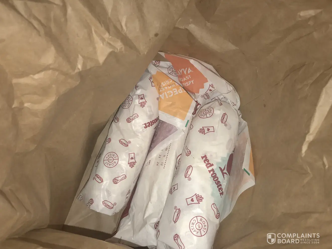 I'm here to complain about the order I just recived about 10 minuets ago from red rooster clarkson