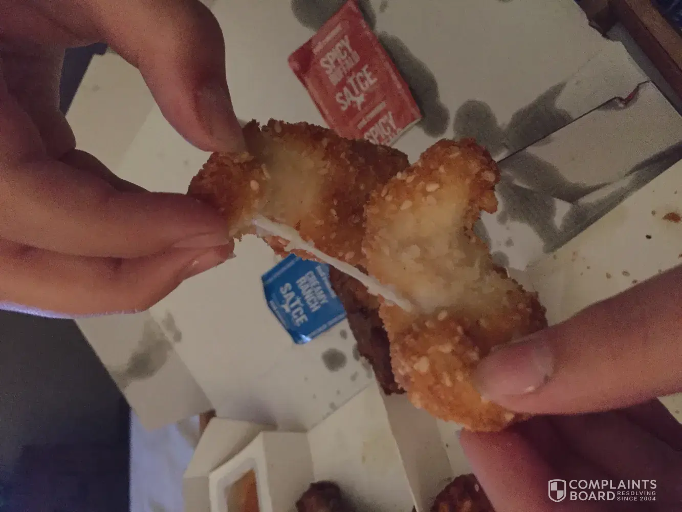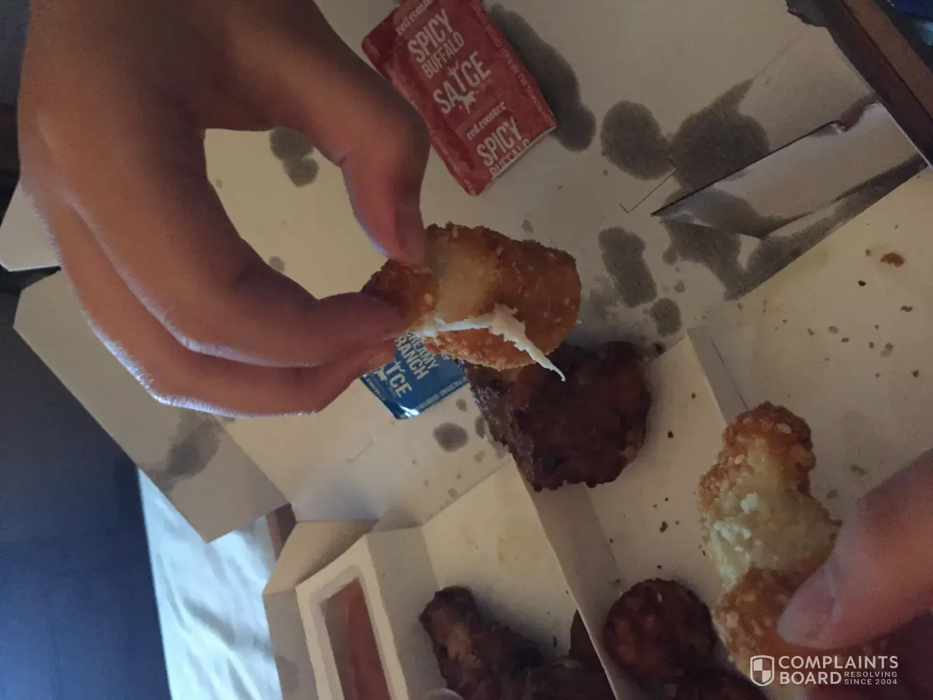 We ordered the dippers box tonight & were unhappy when noticing the potato gems were almost burnt & tasted burnt. And then my daughter went to eat a cheesy nugget & noticed 2 nuggets stuck together bonded by a thick piece of stringy chicken grissle.