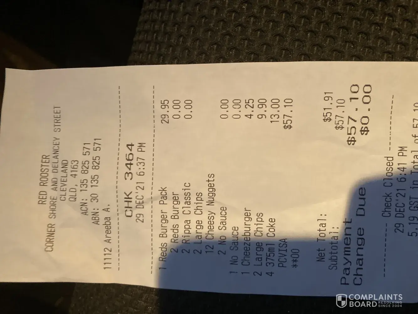 Ordered Red rooster, 20/02/22 @ 11.38,order number 2617 from Baldivas South bound store. When I recieved the order the extra fried chicken I ordered was not as I requested, ordered 3 pieces legs or thighs but recieved breast which was very greasy and very very dry, un edible. With the rest of the order the chip's were so salty they left blisters in my wife's mouth so threw them into the bin, had to use the nuggets in a sandwich for my grand daughter as the chip's were also way too salty for a 2 year old. I lodged an online complaint about the poor quality order at approximately 12.30pm same day. At 3.53pm, 22/02/22 a duty manager named Hurshal called back to discuss the matter, after discussing this matter he tried to resolve the issue by offering to replace the order and give me a full refund. This I thought was generous but was more than happy with, he also said he would personally make the order. When I went back to the restaurant 25/02/22 and spoke with Hurshal he and another manager refused to honour the resolution call and only offered to replace the fried chicken part of the order, after a long discussion with the other manager he offered to refund the fried chicken and replace the fried chicken but would not consider any of the other item's which went into the bin due to very very salty un edible chip's causing the blisters in my wife's mouth.