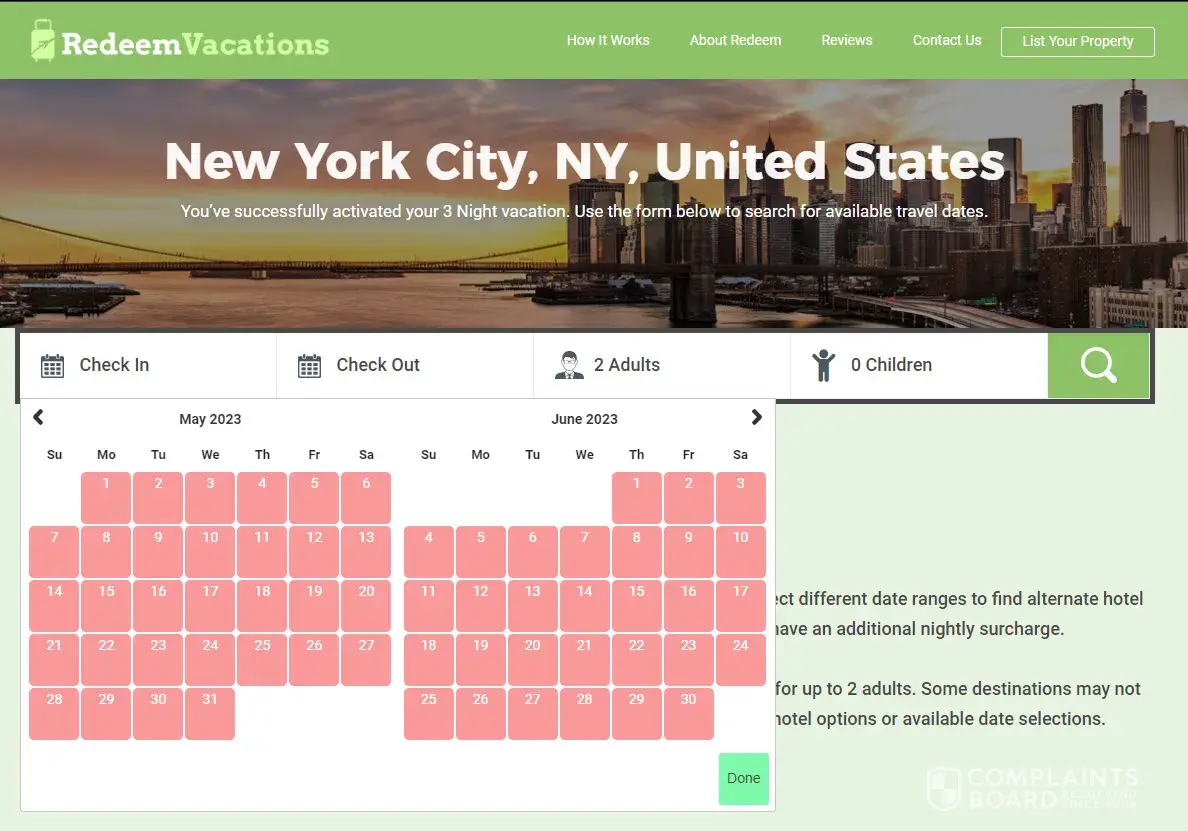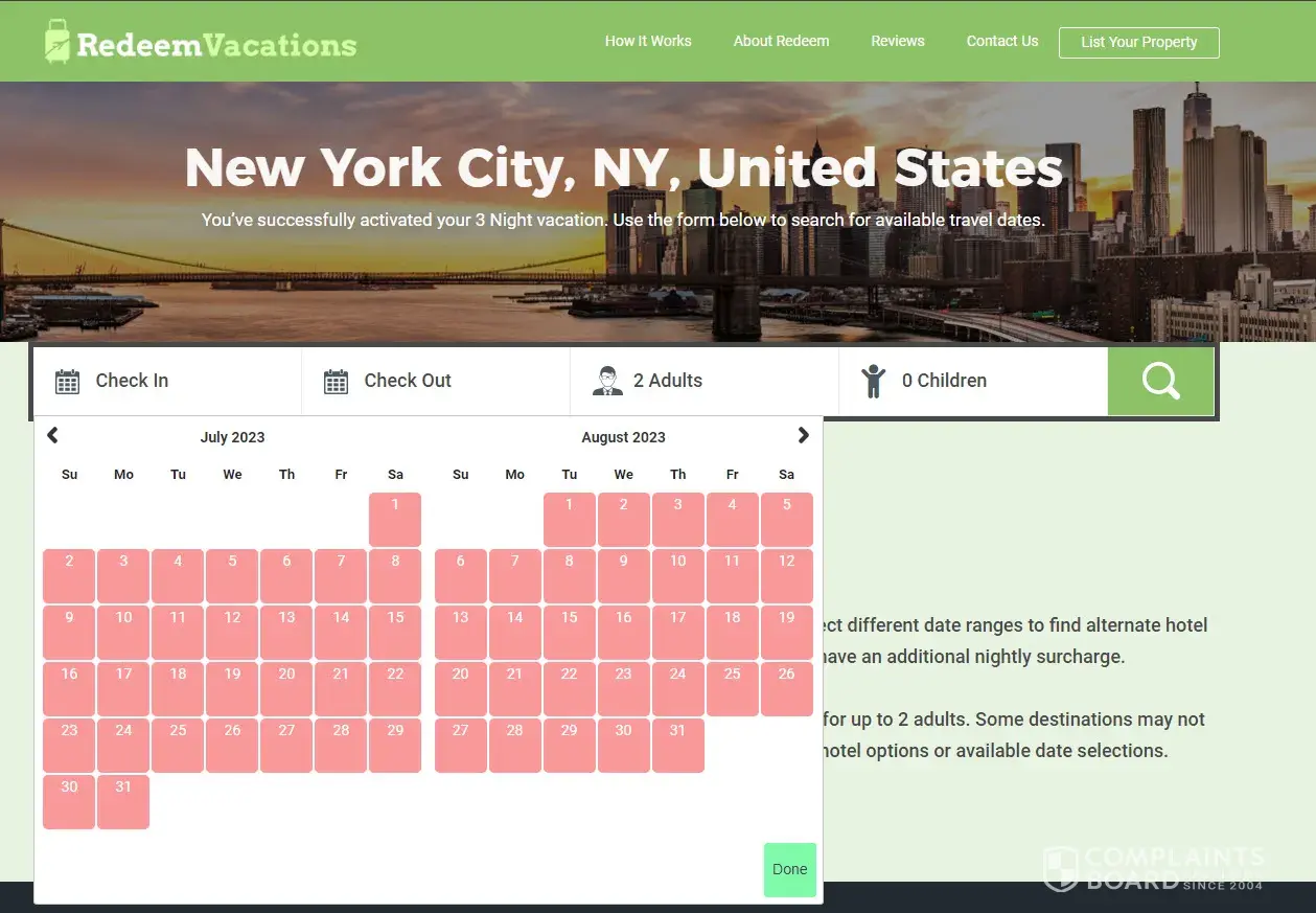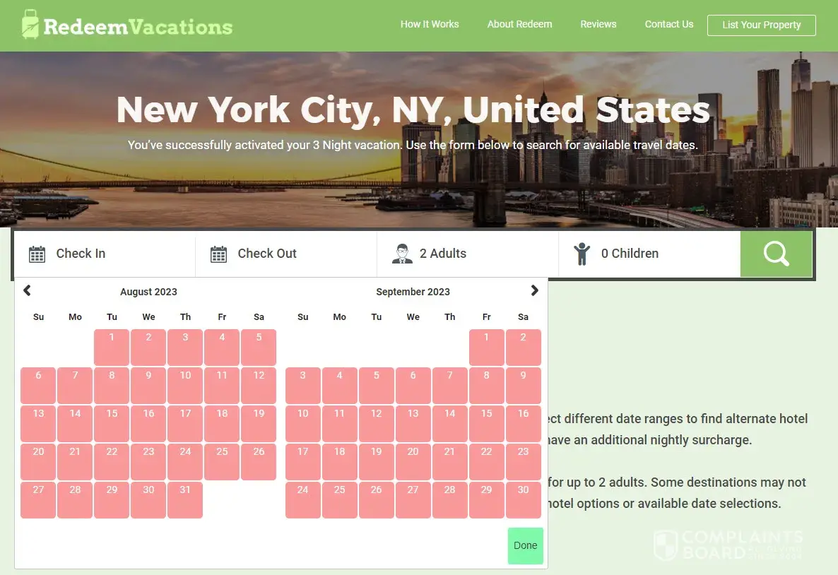According to RedeemVacations site I have 18 months to book a hotel for my vacation. I tried to book a hotel in NYC in April 2023 for August but noticed that all dates from today till September and red. I have tried to contact RedeemVacations via their "Contact Us" page with no response in a week. Didn't find their phone number anywhere and now really don't know what to do.