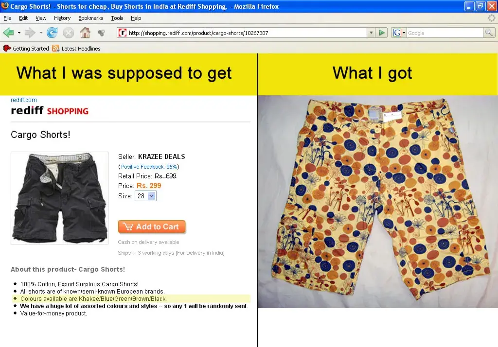 I burnt my fingers with Rediff Shopping. It's shocking that these big portals have no qualms about cheating and deceiving people. I ordered a pair of Cargo Shorts from rediff shopping recently. At least that's what I thought I'd be getting. I happily processed my order, and couldn't wait to pay the courier guy when he reached my house.