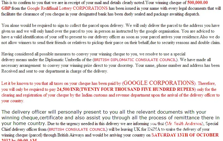 The delivery officer will personally present to you all the relevant documents with your winning cheque, certificate and also assist you through all the process of remittance there in your home country. Due to the urgency needed in this delivery we are informing you that (mr. Smith Anderson), special chief delivery officer from (British Consulate Council) will be leaving uk for india to make the delivery of your winning cheque (parcel) through british airways and would be arriving your country on saturday 13th of october 2012 by 09:00 am