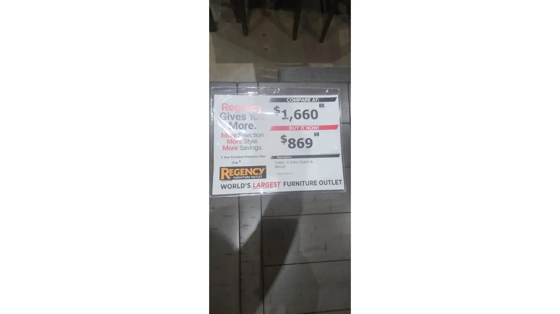 Yesterday, Saturday 11/26/22, I walked into the Regency Brandywine location at approximately 4pm. I was greeted by a very polite young lady with a pixie cut by the name of "Angel". She guided me to the dining room tables located on the immediate left of the warehouse. Where I explored the 'world's largest furniture outlet's dining section and stumbled across a grey table, with 4 chairs and a bench listed with a purchase now sticker of $869.99. The price seemed great so I facetimed my sisters and God Mother (who used to live in Waldorf) to make sure the aesthetic of the table aligned with what I felt was a great "Black Friday Weekend" price.
