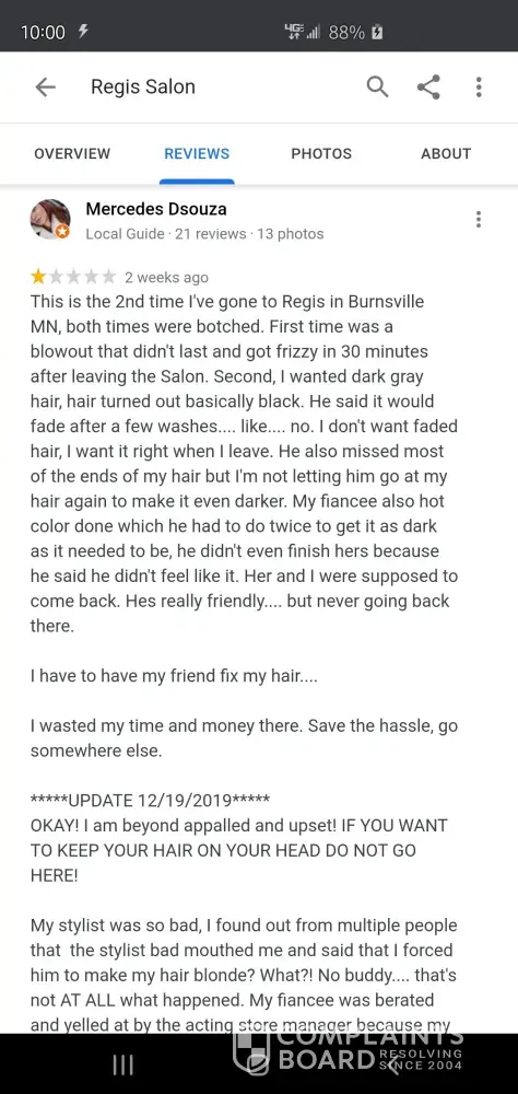 Regis Salons does not hold their stylists accountable for their actions. They allow their stylists to pocket cash and bad mouth unhappy clients. Apparently they also caused Chemical burns to one customer who had to be taken to the Emergency room via ambulance because of the same stylist who RUINED my hair way over processed this girls hair. Contacted their customer support on Dec 19, I was supposed to receive a call back... nothing...