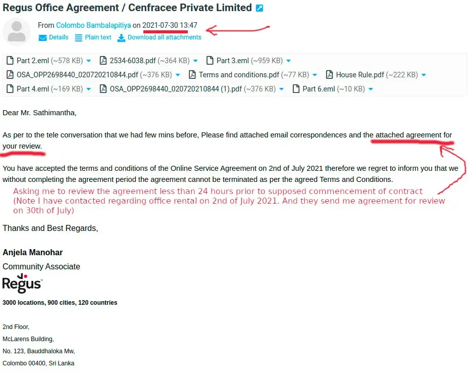 5. When asked about the collection agency, Regus first responded that this was a mistake and told us to ignore. To the follow up enquiry they stated that the claim would be cancelled within 48 hours (as evidenced by the attached email). That was over 4 months ago. To this date we are being chased by the collection agency and are forced to retain legal counsel.