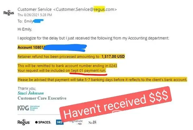 Regus sent a confirmation of termination email and email chain was also started about the refund for canceled services and retainer.