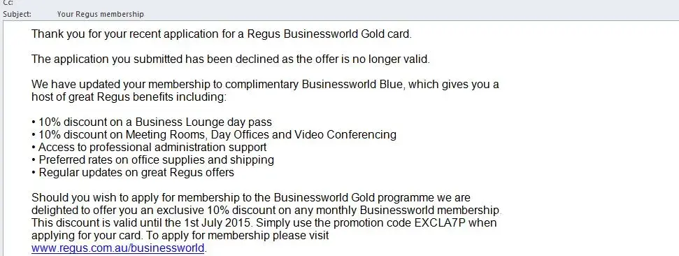 There was an offer on an Australian board for free Businessworld Gold Membership for a year with Regus. I applied and my membership was approved. Here is their email: