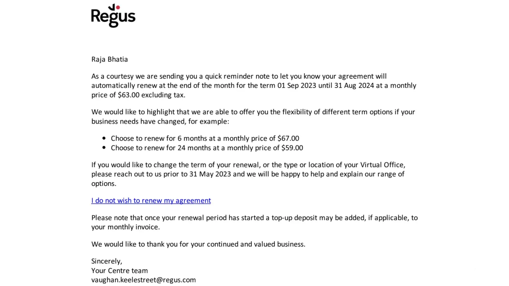 Further exchange with Regus: