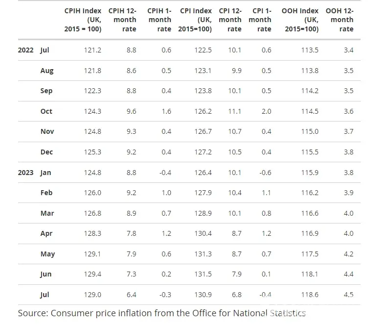 • The Consumer Prices Index including owner occupiers' housing costs (CPIH) rose by 6.4% in the 12 months to July 2023, down from 7.3% in June.