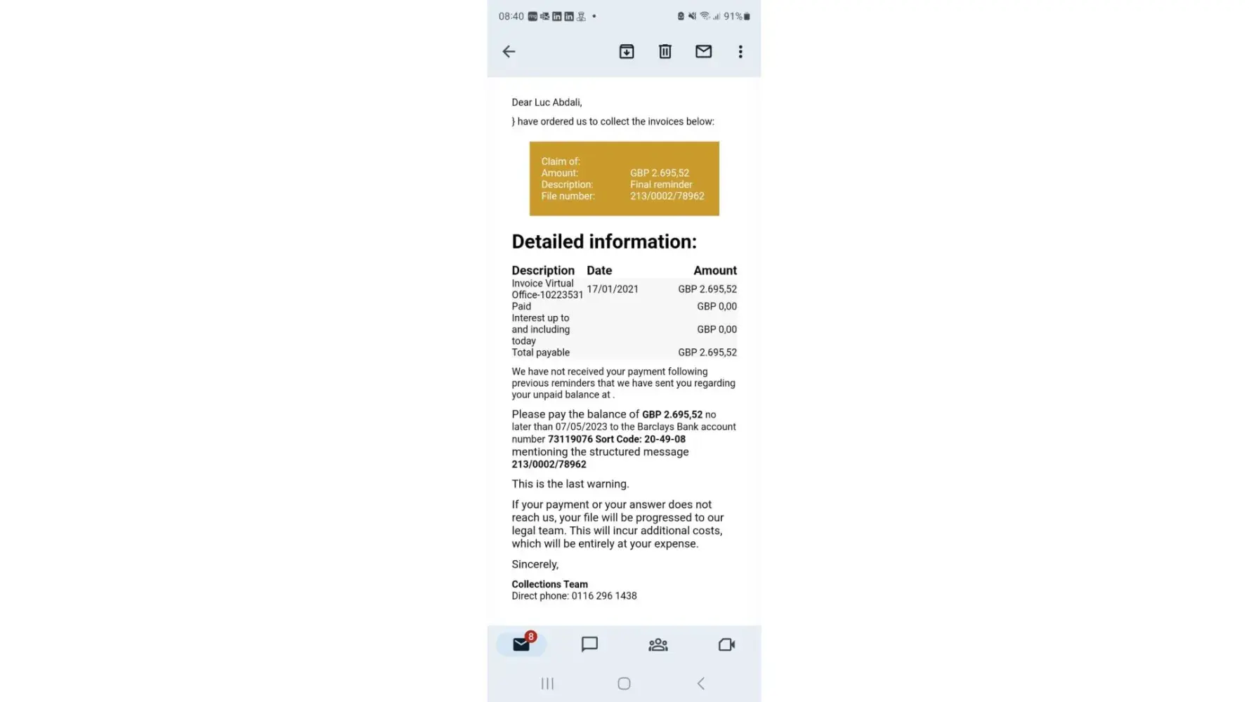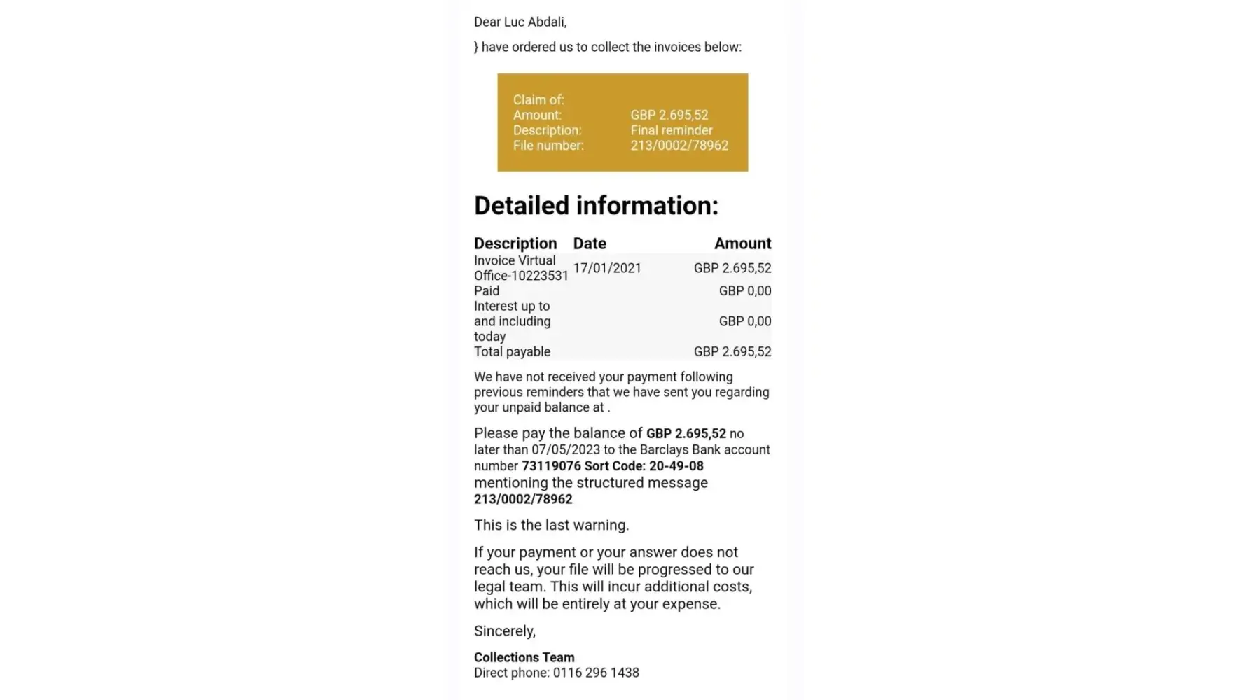 Desired outcome: Luc Abdali,[protected]@mtschauffeur.co.uk--------------------------------------Description Date AmountInvoice Virtual Office-[protected] 17/01/2021 GBP 2.695,52Paid GBP 0,00Interest up to and including today GBP 0,00Total payable GBP 2.695,52
