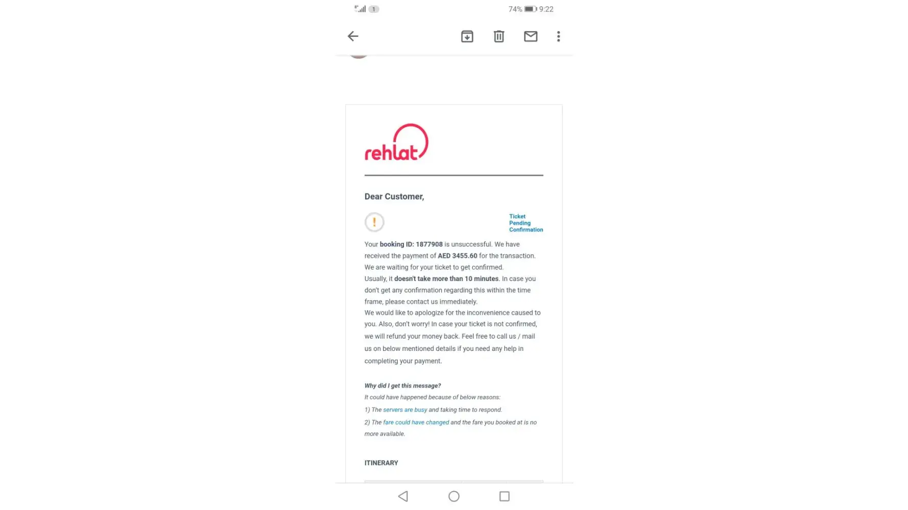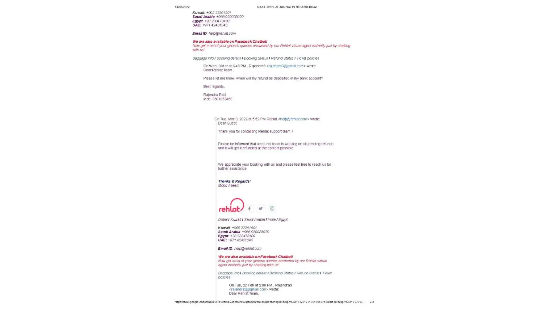 i book tickets then suddenly it was cancelled by rehlat, i ask for refund but they sent only 202 aed . balance 2869 aed still pending, i am calling helpline from 2 months daily and sending emails but no responce even no reply of emails.