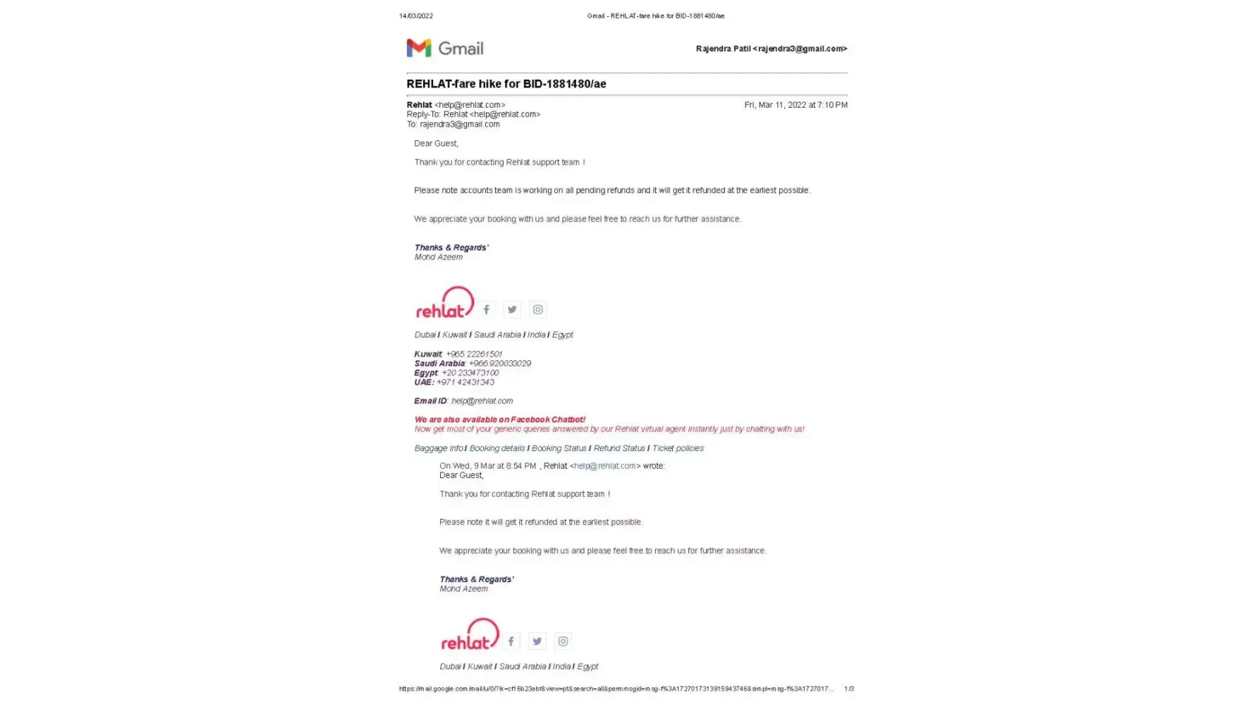 I paid the ticket fare to Rehlat. This is pending from 3 years. Rehlat is not replying to the emails when they will refund the ticket. Kindly do the needful at the earliest.