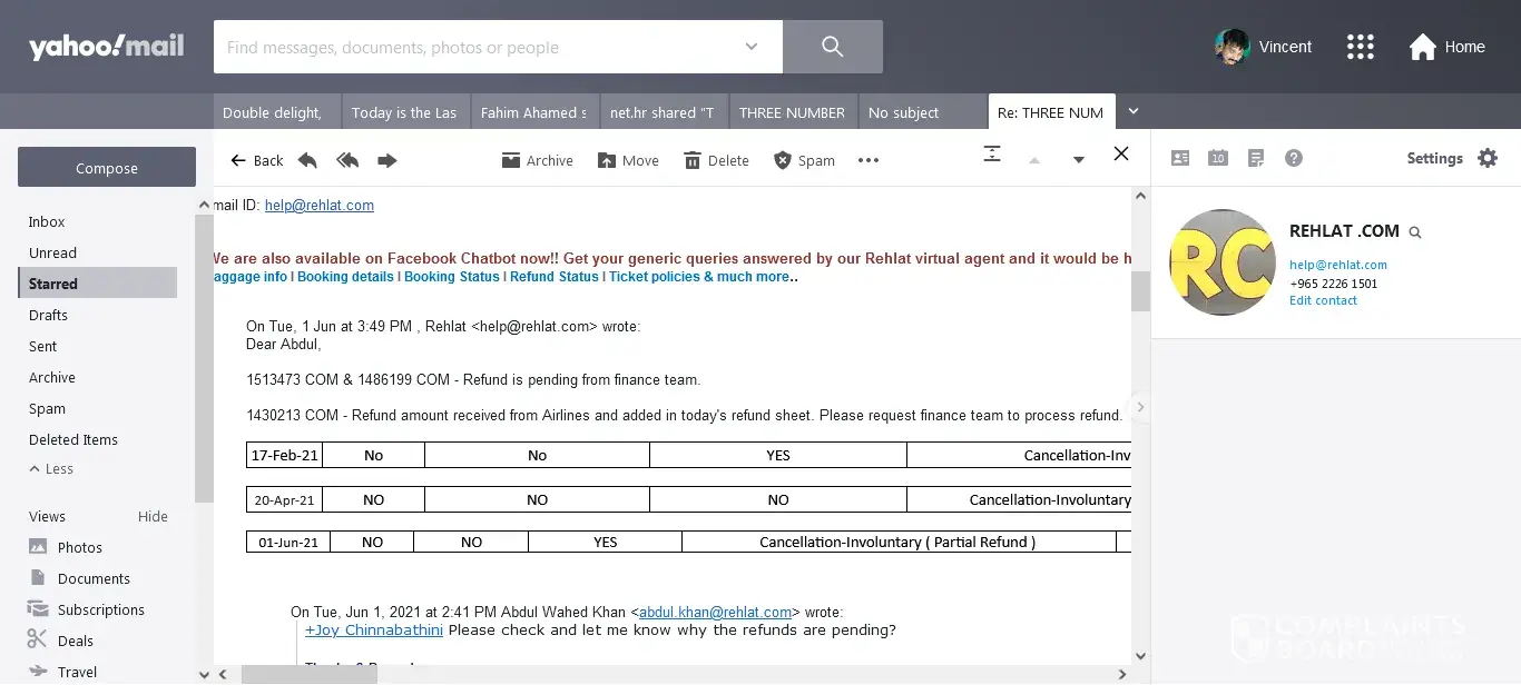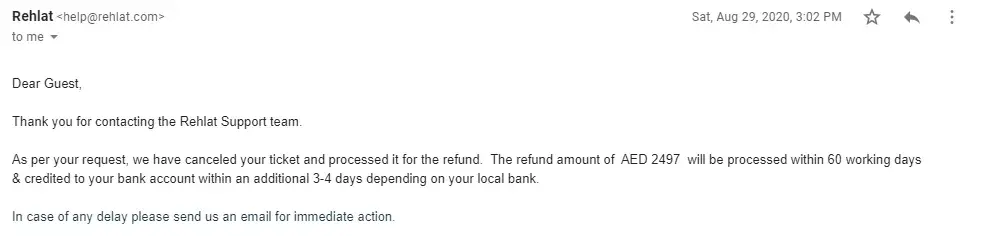 My booking ID is 1702993, I am following up with Rehlat team almost one year for refund process. Please see the attached snap, Rehlat confirmation that the refund will be processed within 60 days from 29th Aug 2020 but today date I used get the response striving to close the case at the earliest but it's quite unfortunate that the refunds the getting delayed, kindly allow us time and we shall update you as soon as it's done. Could you please look into this and let me know the exact status of the refund process?