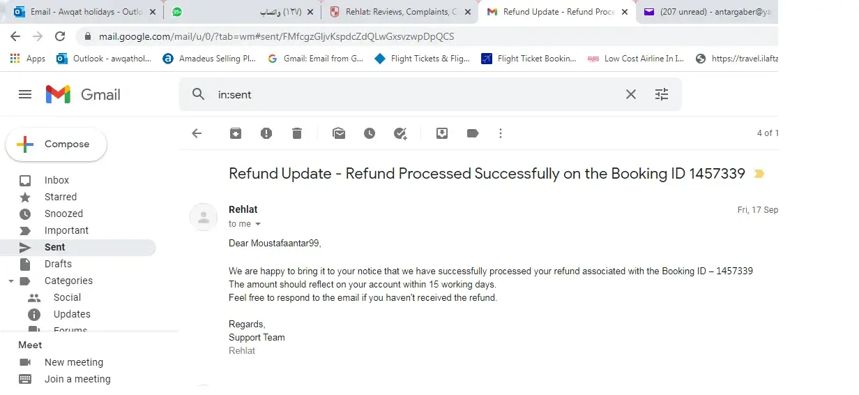 I sent to rehlat my bank account balance sheet 2 times showing that no amount credited to my account concerning the refund of booking id 1457339