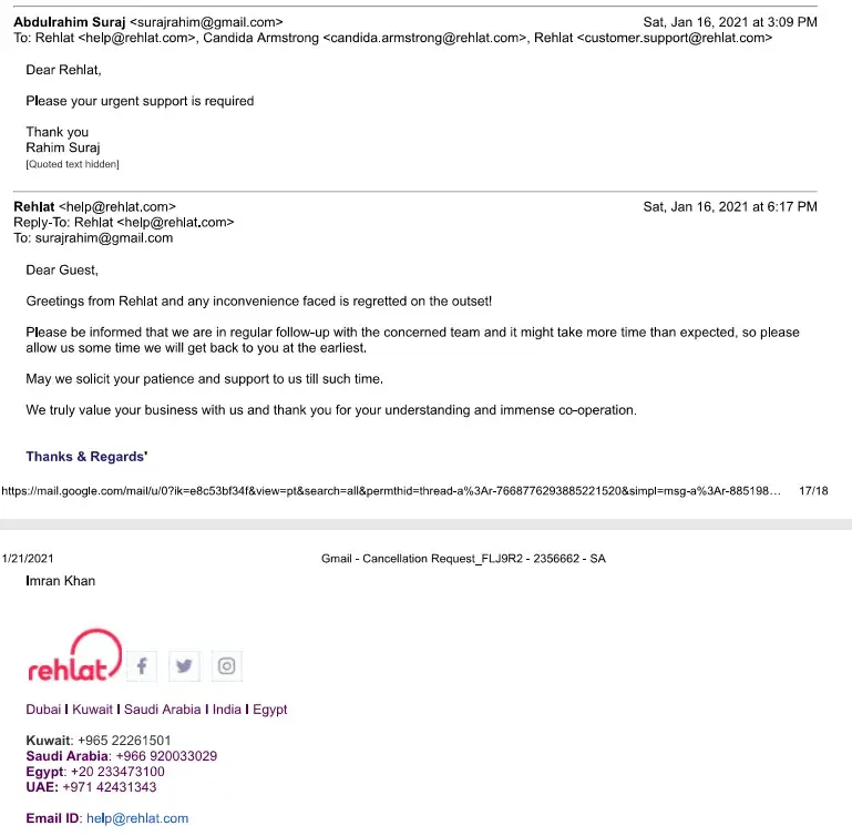I have sent several emails to Rehlat. I went to their office in Hawally Kuwait few times but in vain.