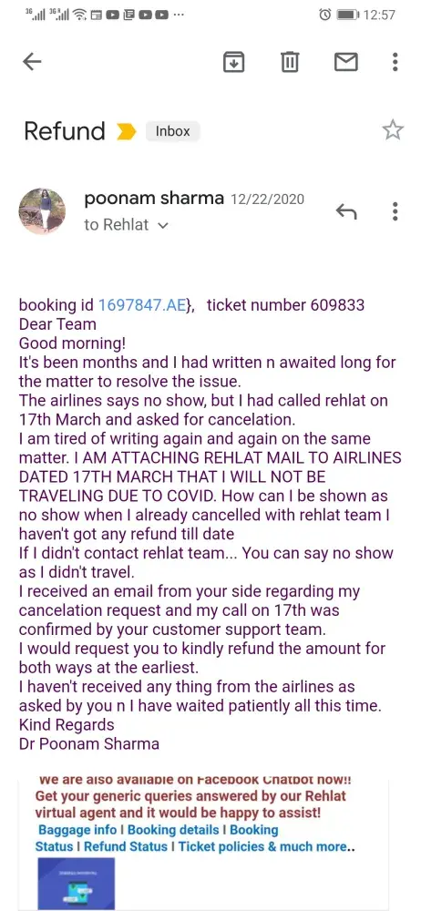I am tired of writing again and again on the same matter. I am attaching rehlat mail to airlines dated 17th march that I will not be traveling due to covid. How can I be shown as no show when I already cancelled with rehlat team I haven't got any refund till date