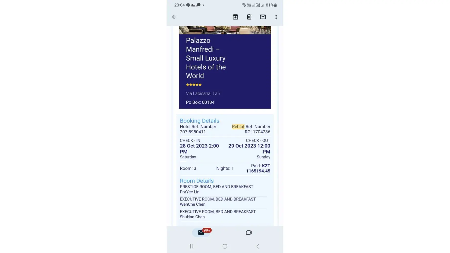 I made a booking of luxury hotel saty for my trip in Italy on this March, 30. The rate I booked is for free cancelation. However, Although I have canceled my booking on this March, 31, and received the confirmation of my cancelation. I have not received my refund until now. I have emailed and made a phone call to their customer service, but they always use 'financial team problem' as excuse. My booking number is RGL1704236. Please help me to resolve the issue and have my refund back. my email is [protected]@gmail.com. Thanks.