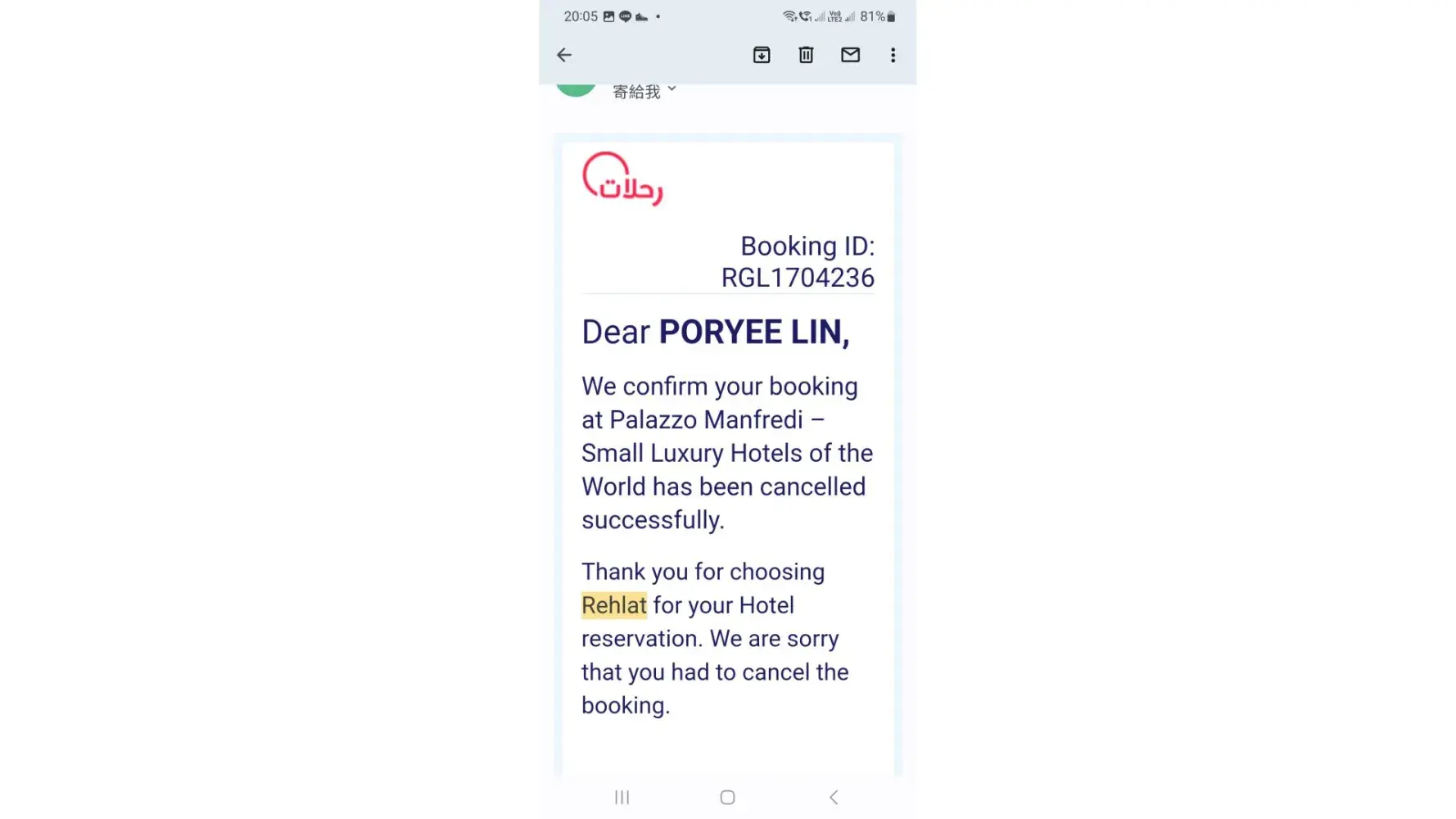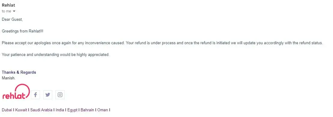 Please find below the email of Rehlat to my agent after cancellation of booking.