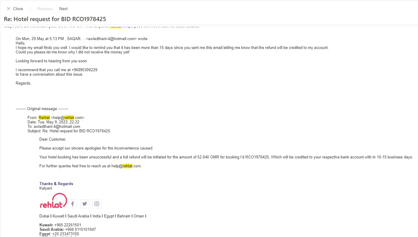 We made a booking with Rehlat in MARCH 16 (booking #RGL1640631) and cancelled the reservation on MARCH 25 and i have received an email that cancellation request was received (ticket number 1135233). We called they said they couldn’t retrieve the ticket hence promised us they’ll be processed within 2-3 working days and should be credited within 1-2 weeks maximum. Here we are 3 months and countless of calls after haven’t received any payment yet. Every time I called they promised to speed up the process & will update the refund status within 24hours via email but there was no email received for any of the calls that were made!