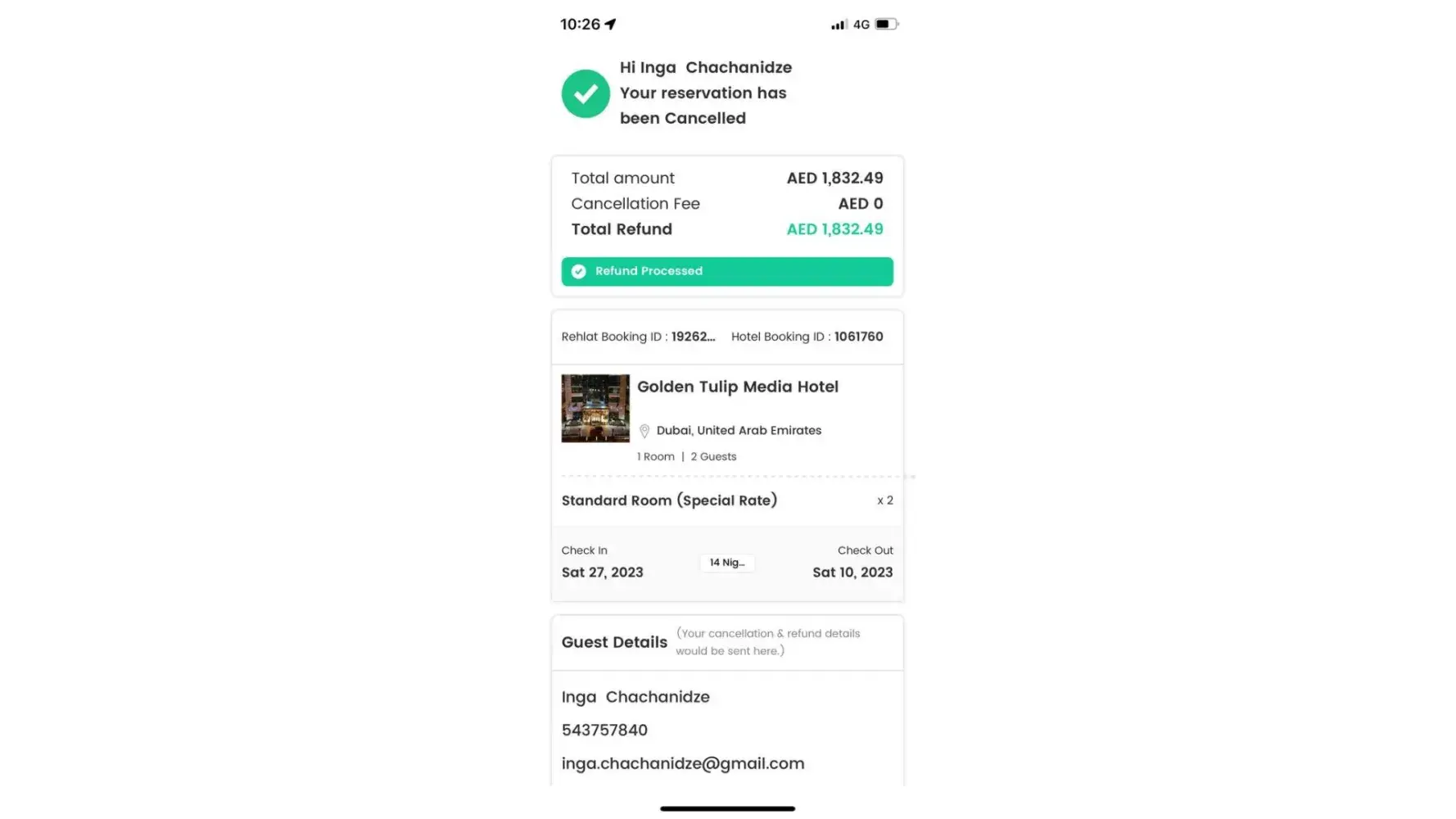 Please accept our apologies once for any inconvenience caused. Your hotel booking has been cancelled and a full refund will be initiated for the amount of 2,482,95 AED & 1,738,068 AED for booking I'd Rae 1926348 & Rae 1926244 ,Which will be credited to your respective bank account with in 10-15 business days.