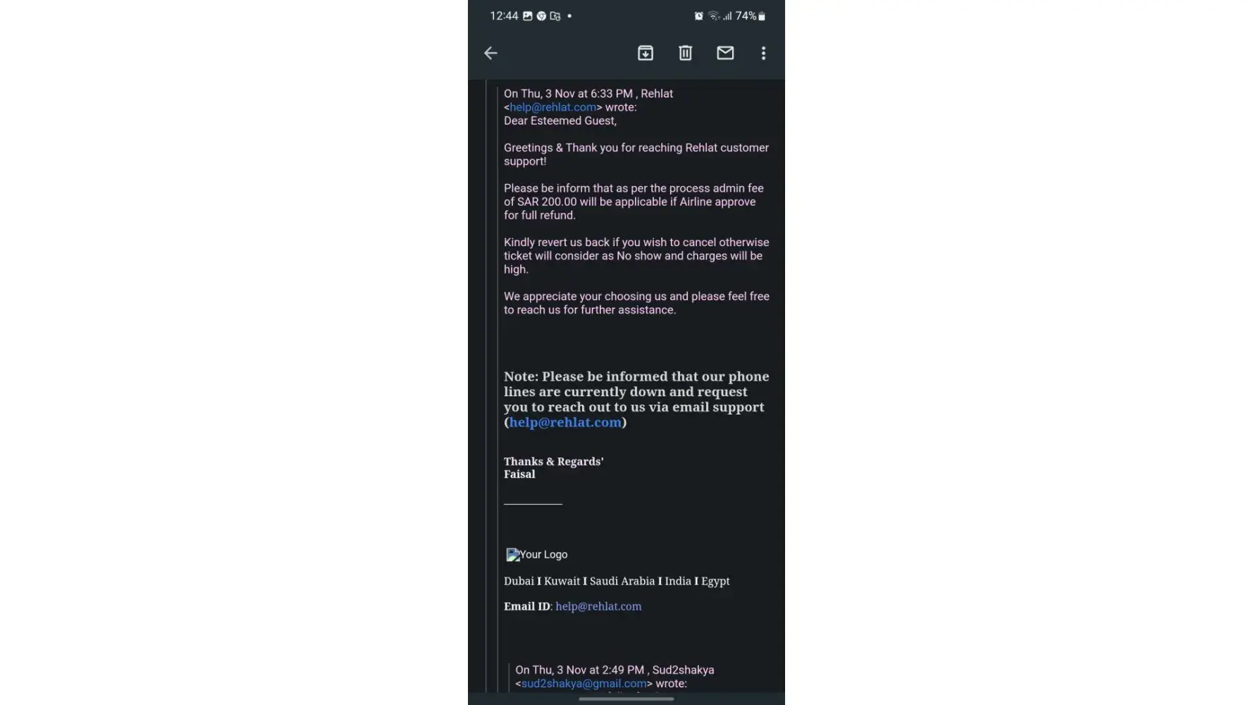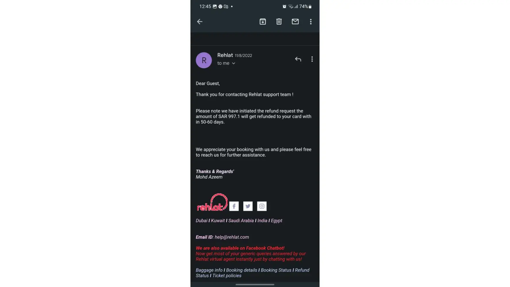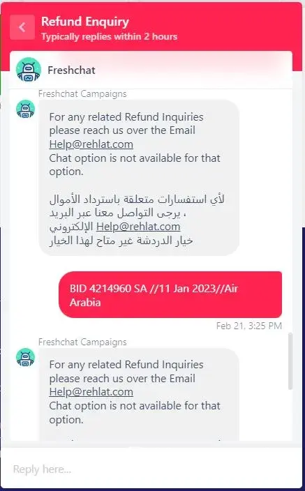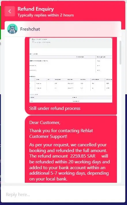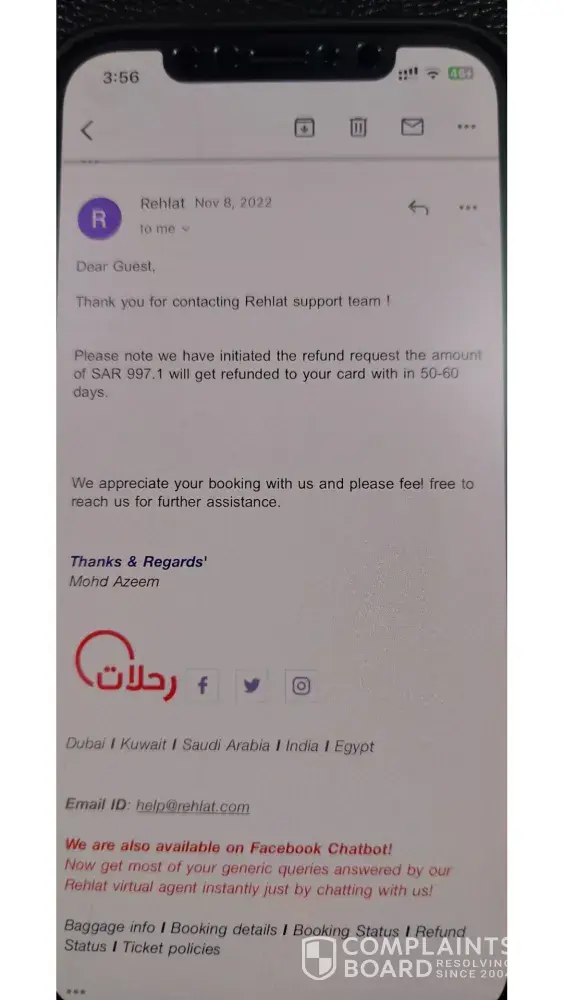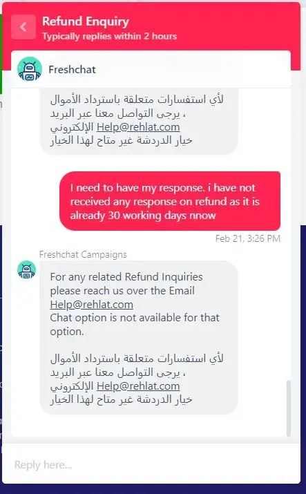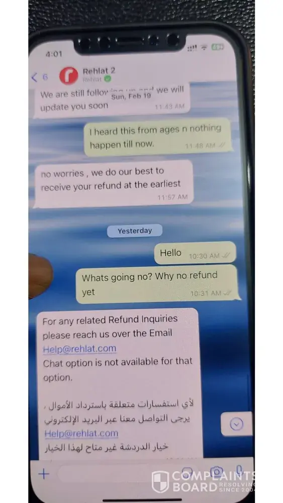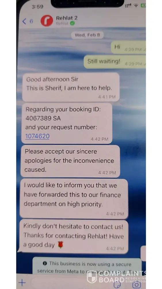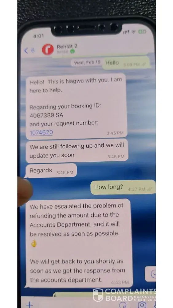 I booked a flight ticket from Rehlat on Nov 4 2022, Dammam - Muscut - Manila. At first Rehlat confirmed that ticket and charge the amount but later after asking manytime the ticket number, they said its not available and need to find another date. As the passanger couldn't wait, i asked to refund the money. Even though its not my fault, they said they are going to charge their service and will refund the balance SR997 after 50-60 days. I waited and started calling them after that given time abd now almost 4 months but everytime i called them, their reason their account department delayed. Now they don't reply my message or calls. Plz help!