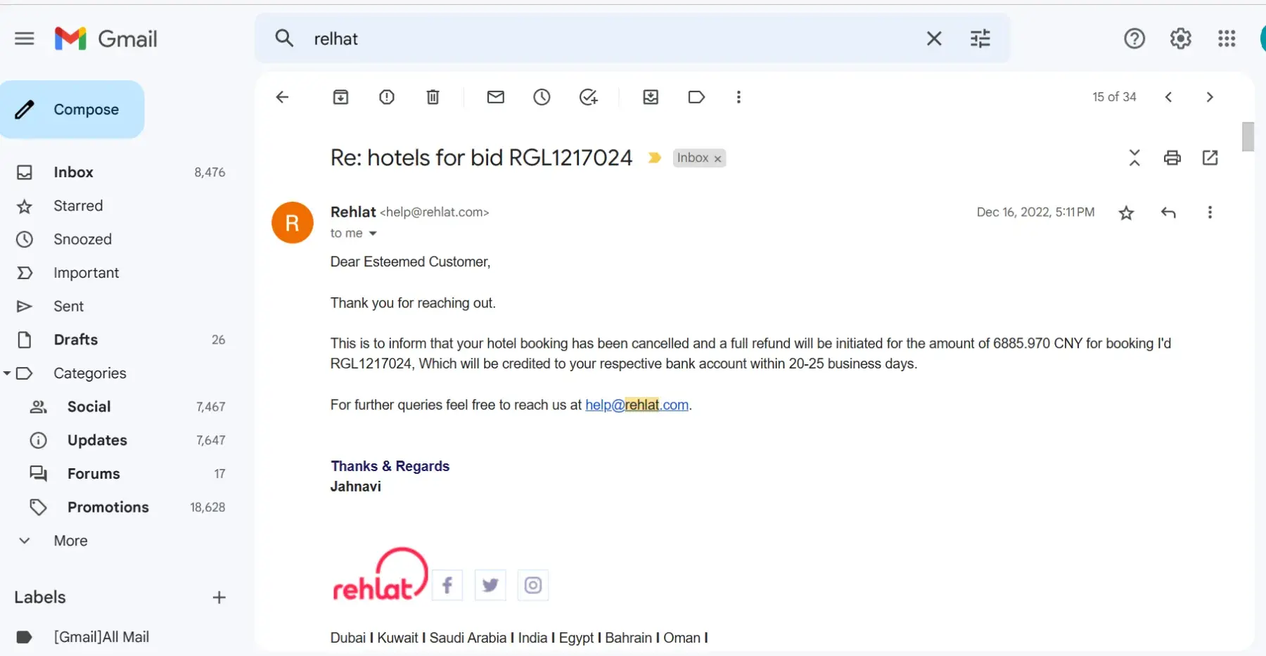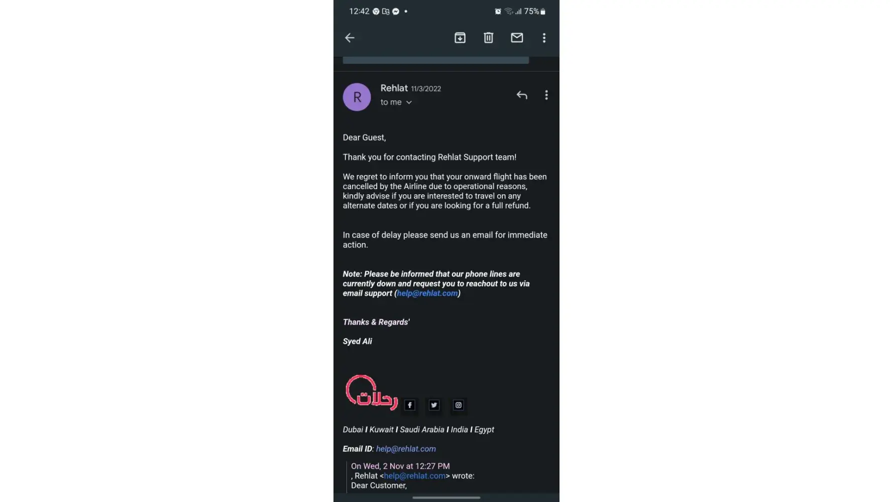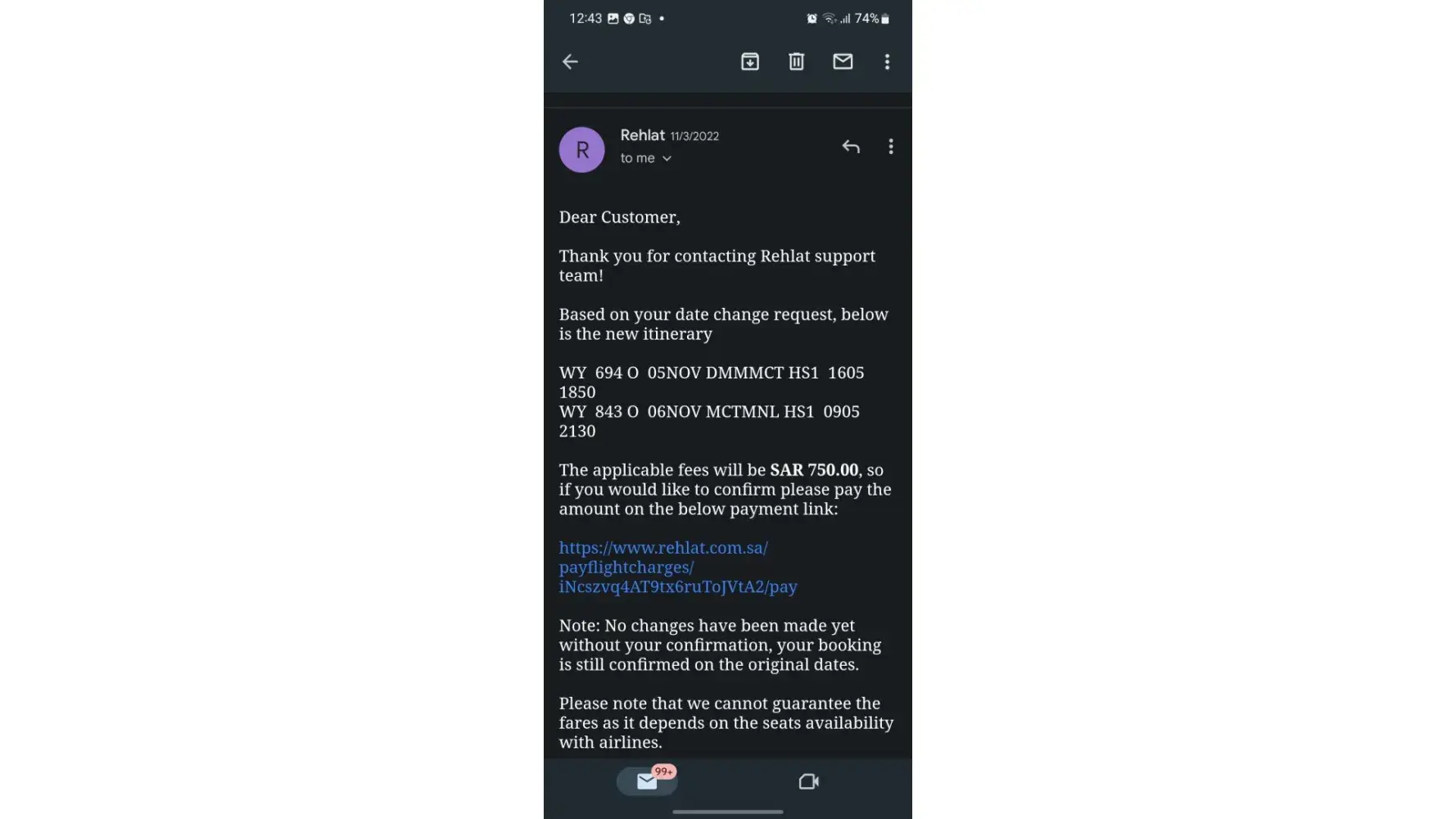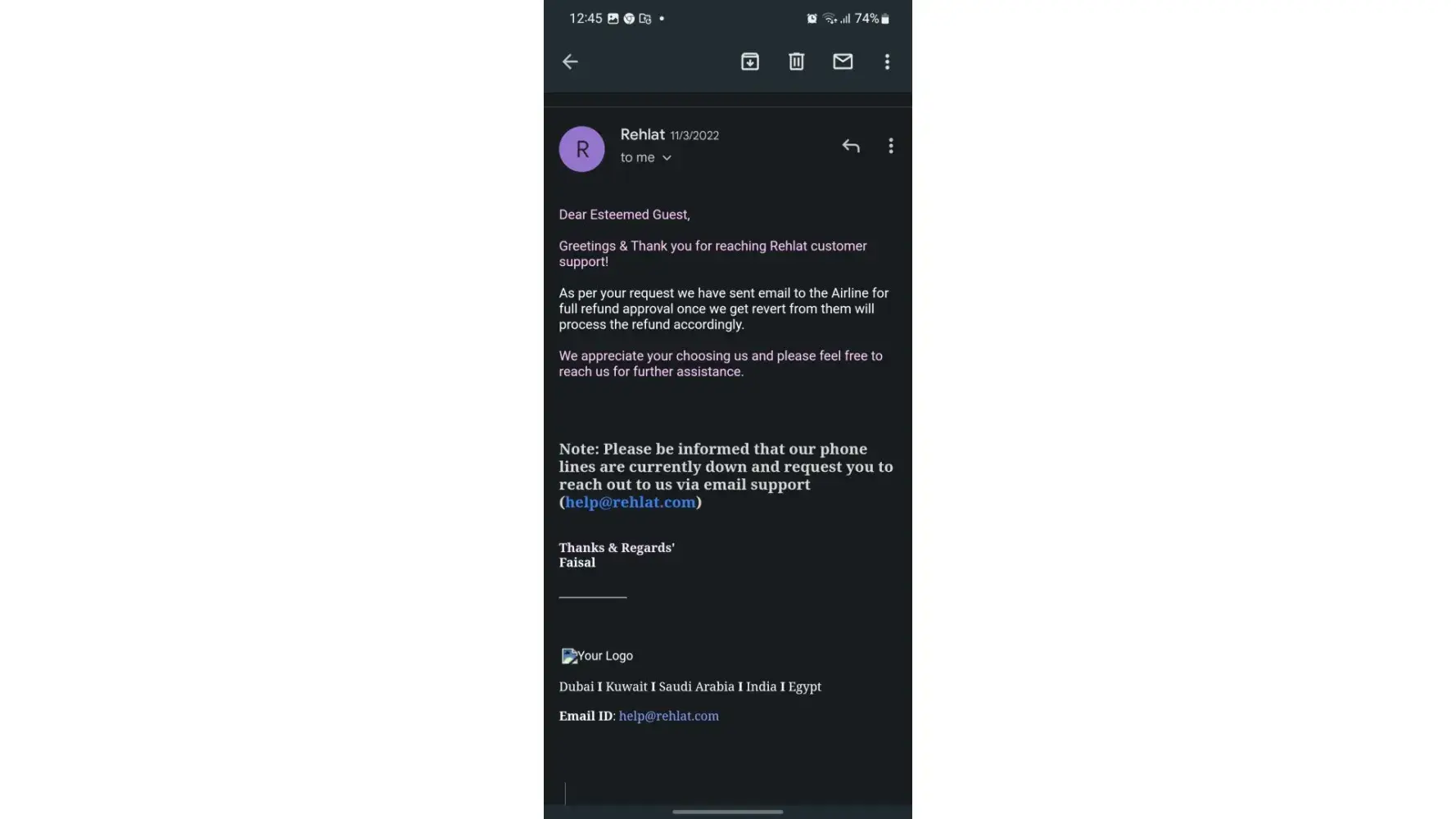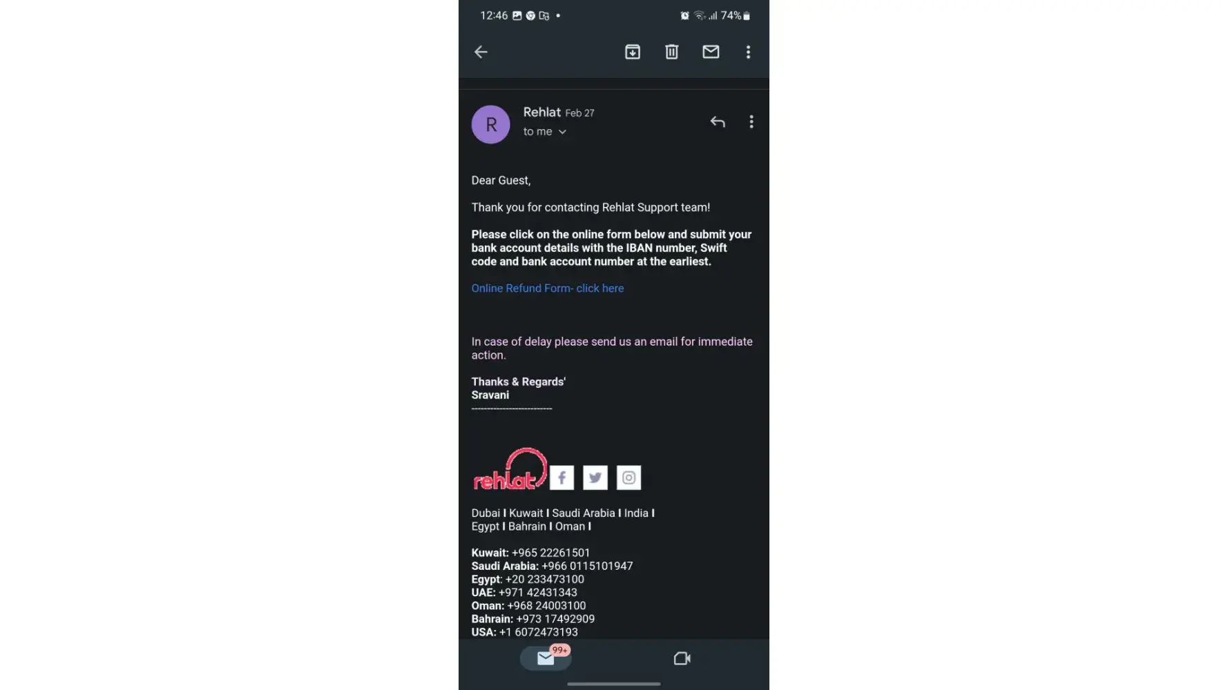 I booked a flight ticket from Rehlat on Nov 4 2022, Dammam - Muscut - Manila. At first Rehlat confirmed that ticket and charge the amount but later after asking manytime the ticket number, they said its not available and need to find another date. As the passanger couldn't wait, i asked to refund the money. Even though its not my fault, they said they are going to charge their service and will refund the balance SR997 after 50-60 days. I waited and started calling them after that given time abd now almost 4 months but everytime i called them, their reason their account department delayed. Now they don't reply my message or calls. Plz help!