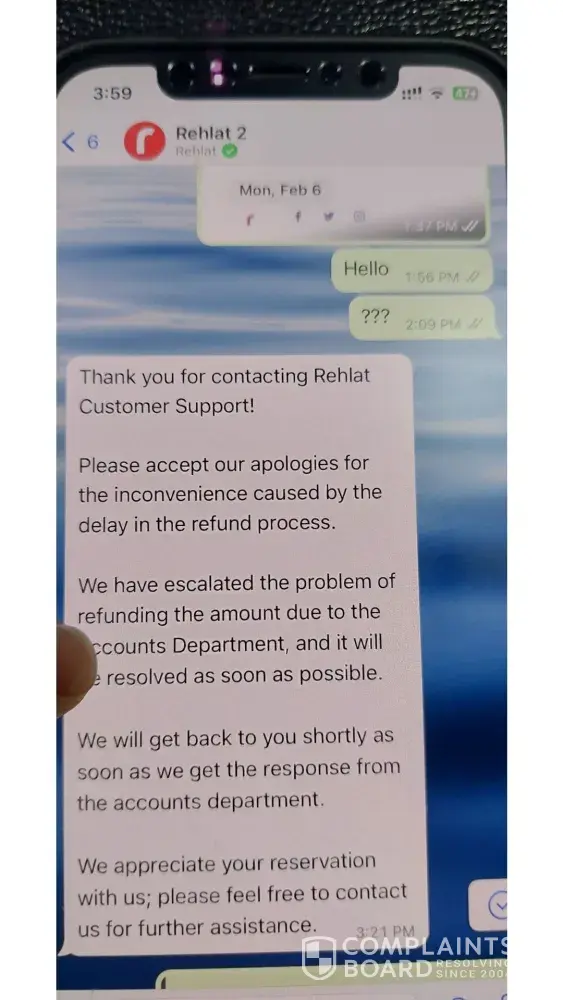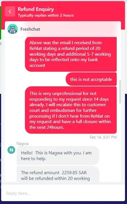 This is very unprofessional for not responding to my request since 14 days already. I will escalate this to customer court and ombudsman for further processing if I don’t hear from Rehlat on my request and have a full closure within 24hours.