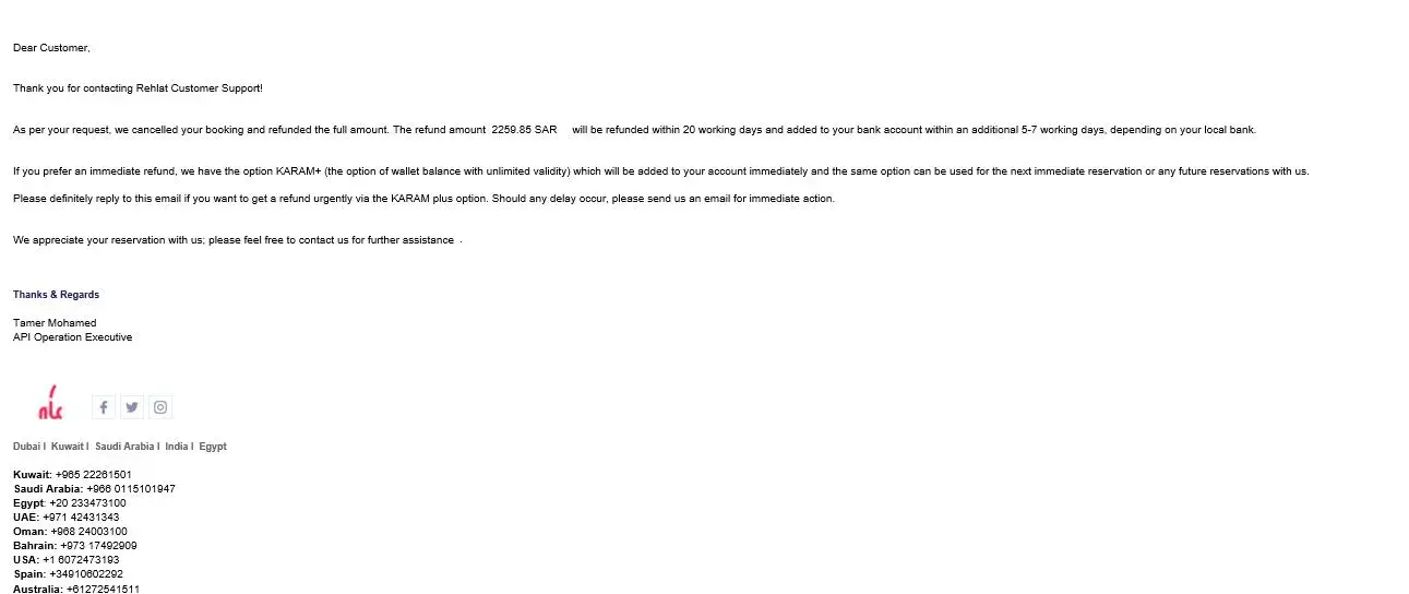 If you prefer an immediate refund, we have the option KARAM+ (the option of wallet balance with unlimited validity) which will be added to your account immediately and the same option can be used for the next immediate reservation or any future reservations with us. Please definitely reply to this email if you want to get a refund urgently via the KARAM plus option. Should any delay occur, please send us an email for immediate action.