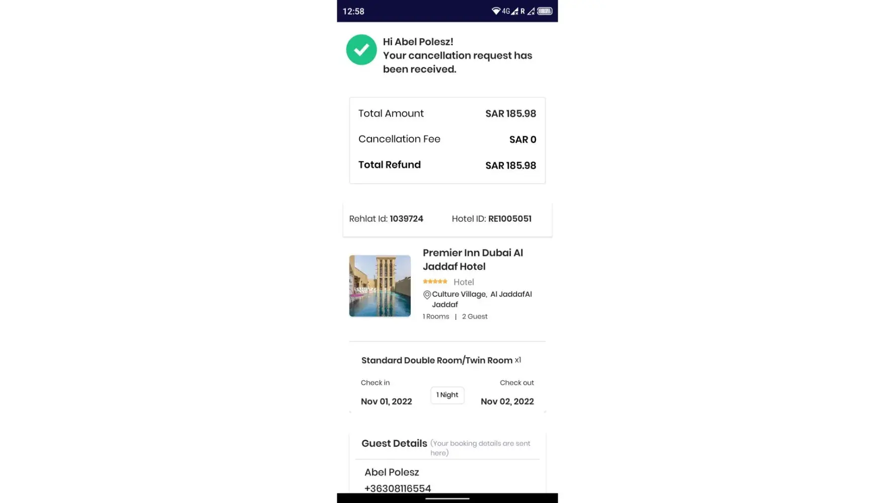 As per your request, we cancelled your booking and refunded the full amount. The refund amount 2259.85 SAR will be refunded within 20 working days and added to your bank account within an additional 5-7 working days, depending on your local bank.