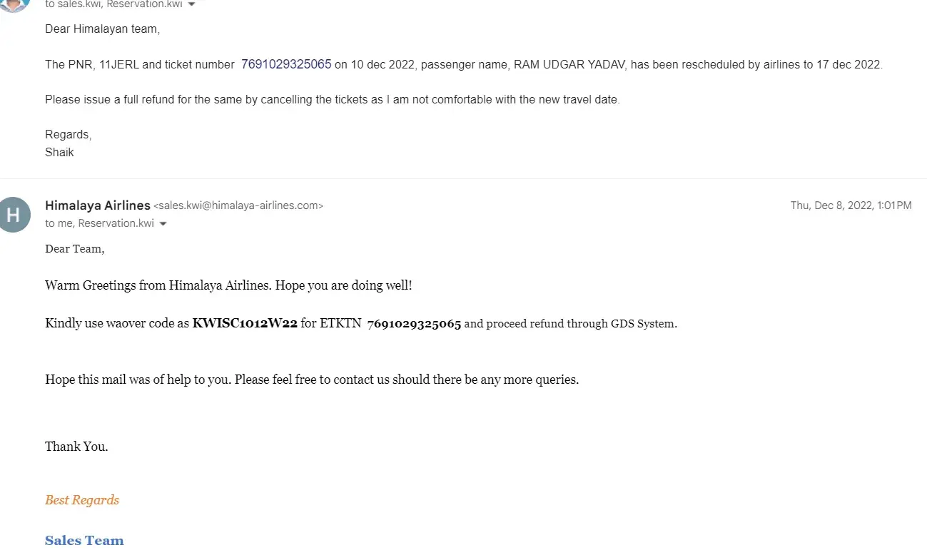 The flight had been rescheduled and cancelled afterwords. same has been refunded through GDS system from himalayan airways but Rehlat till now not refunded for the same and asking to admin fee around 16kd which is not acceptable for me. total amount to be refund is 38kd