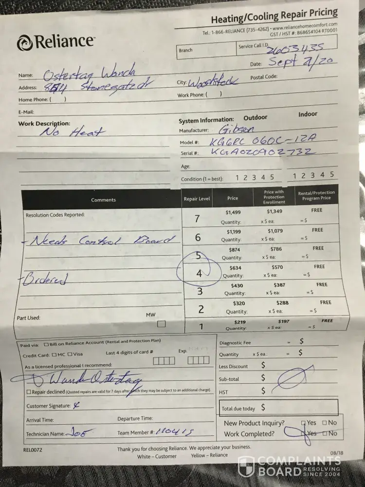 My furnace broke on November 14th 2020. I called Reliance where a technician came and told me that the motor and board was broken and had to be replaced. He called the company he deals with on November 16th where they gave him a price. The technician called Reliance to tell them how much it would cost and they said it was too much and they were going to send one from their warehouse. I called on November 17th since it was 20 below and my house was 14 degrees. I was told to go and buy some space heaters and they would reimburse me. I was also told not to worry since the part would be in on November 18th. November 18th no part arrived. On November 20th I called Reliance again where I was told it would be in on Saturday November 19th. (Now it has been a week with no heat in Northern Ontario where the temperatures are quite cold!). Today is November 23rd and I still do not have the parts required for my furnace! I called Reliance again where I was told they were going to try and track the package and call me back- I have not received a return call! If Reliance would have agreed to the part from the technician I would have heat in my house! It is going to be 21 below tonight and my house will be cold! I am at the point where I feel I will have to change companies for my furnace as this is ridiculous! I am beyond frustrated! I will NEVER recommend Reliance!