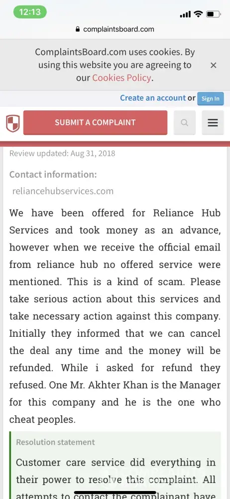 We have been offered for Reliance Hub Services and took money as an advance, however when we receive the official email from reliance hub no offered service were mentioned. This is a kind of scam. Please take serious action about this services and take necessary action against this company. Initially they informed that we can cancel the deal any time and the money will be refunded. While i asked for refund they refused. One Mr. Akhter Khan is the Manager for this company and he is the one who cheat peoples.