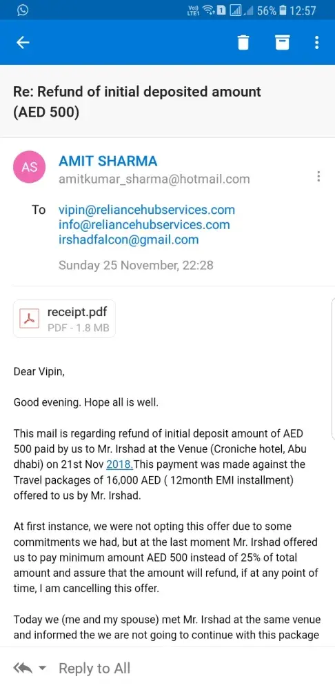 He isisted me to pay 25% of total, but i said no and paid 500AED. Next day we want and asked for refund, they told us to drop a mail to customer care, agent and his manager.