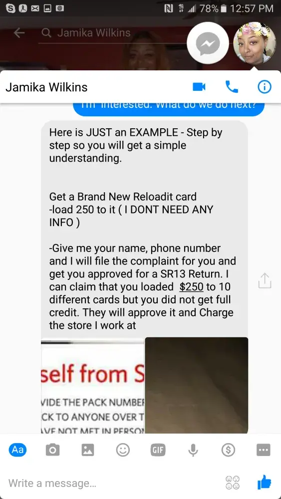 See photo and fb message below. This lady works with a thief that is employed by reloadit. Makes claims on you behalf and has a cs representative call you to get the info and they take your money. Apparently they work for this company and know the ins and out. Don't be a victim to this nonsense!