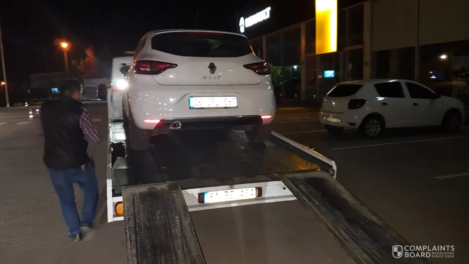 * We loaded my vehicle to the tow truck, took it to the Duzce Renault Ernaz dealer, and handed it over to the security guard. I was asked to come to the service at 08:30 on Monday.