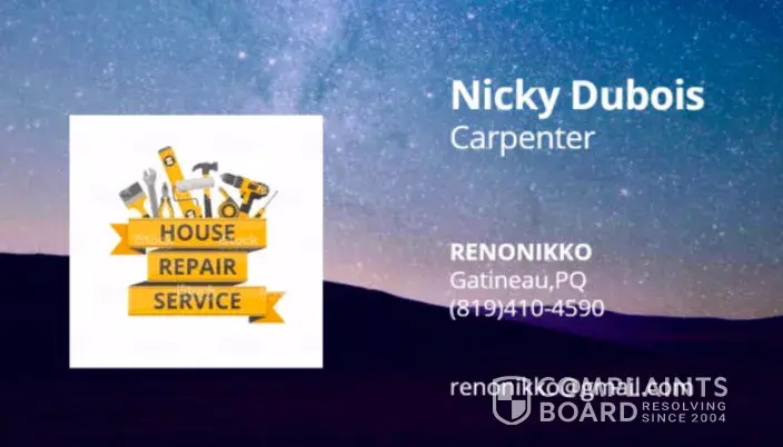 We have opened the police investigation of the fraud committed by Nicholas Dubois (different spelling of the first name, but the same person), operating under the "Carpenttry.works" company name, which is not registered in Quebec.