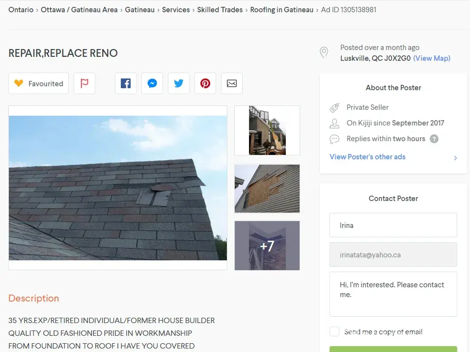 We filed a case with the Gatineau police as we were certain that he had done this to other individuals. The Gatineau police did nothing despite the detailed accounting and photographs we provided. They indicated it was a civil matter. From the date of these posts, it looks like he is still committing fraud and ripping people off four years after he ripped us off. The Gatineau police should have stepped in.