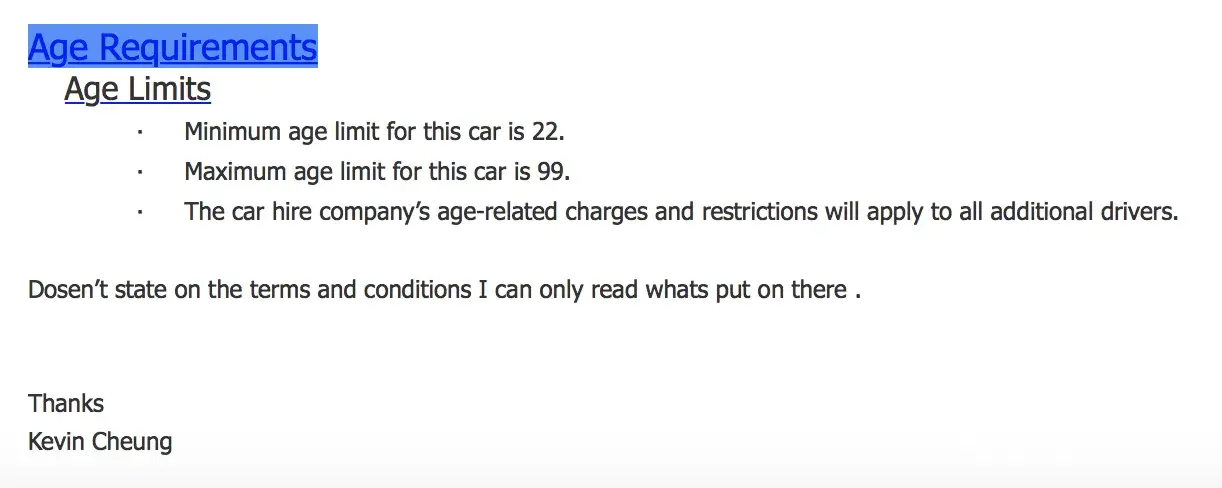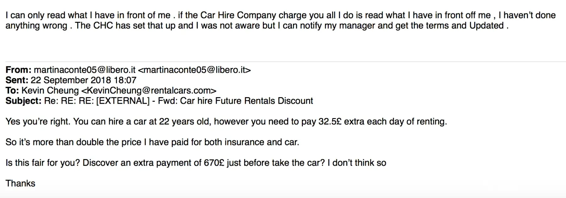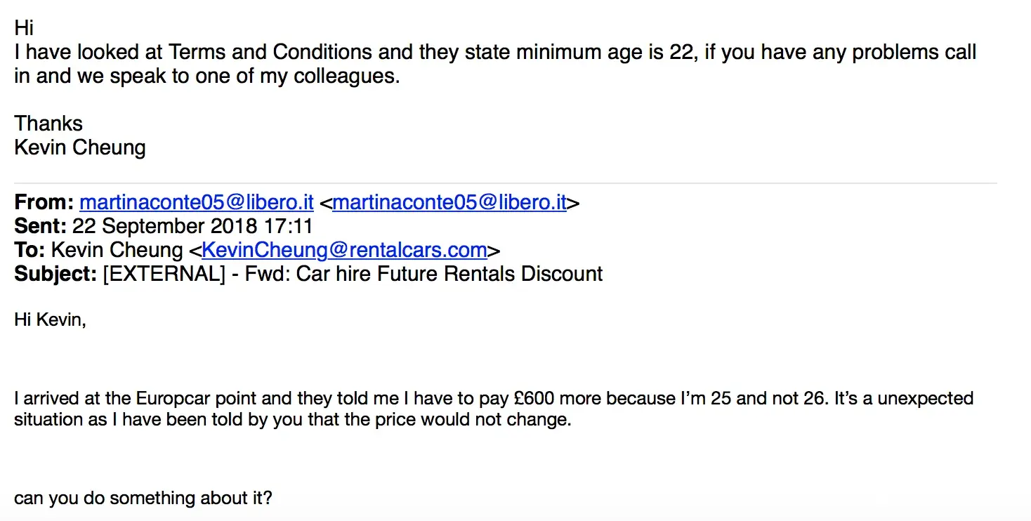I rented a car through your telephone support. I have asked every possible question to make sure everything was complying with the car rental terms and condition. My pick up point was Heathrow Airport on the 22 of September at 5 pm. When I got to the desk of the car rental company (Europcar) I have been told that an extra payment of 30£ per day (for a total of over 600£ on top of what I was already been purchased for 3 weeks rental) was required to rent the car because the of the age restriction policy (I am 25, they require a minimum age of 26 years old). I haven't expected such an awful surprise since, as I stated before, I asked every possible question to the operator on the phone, age restriction included. I have been suggested by the operator at the desk (working for Europcar) to call you and ask to move my booking to another rental company with which I would I have been complied with. Unfortunately, your operator could help me in any way because the prices to rent any car were at least doubled. On top of this, while I was on the phone, I have been told by your operator that the cancellation fee was of 49£. Yesterday I have received an email from you saying that my cancellation fee was 63£. This is the result of a complete incompetence in managing your customer service. I am attaching the email that the operator I have booked with, Kevin Cheung, sent to me afterwards, as a proof of your unprofessionalism. I would never recommend your service to anyone. You are the most disappointing experience in car rentals I have ever had.