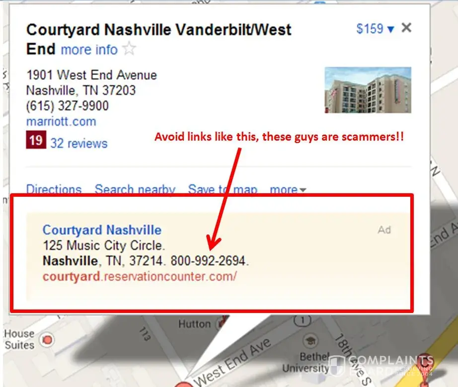 I googled hotels in the Nashville area and chose a Courtyard Marriot off google maps located on West End. When I clicked on the reservation link under the hotel information (which as I look at it now, has tiny writing saying it is an "ad") I was taken to a website that looks very similar to Marriots website and allows you to make reservations for hotels. When I made my reservation, I recieved and email confirmation saying I was booked at a Courtyard Marriot in Nashville, but the address was on the other side of town. I called the number for cancellations and they said they would be happy to help me. (The customer service representative spoke very broken English, leaving me to believe that this is a foriegn company). He said he would be happy to help me change my hotel to the side of town that I wanted. He informed me that he was unable to book me at the Courtyard Marriot on West End, but he had another Hotel (Aloft Nashville) that was 2 blocks away. I said that would be fine. At the end of the call, he informed me that I needed to call another phone number to complete my cancellation request. When I called the number, a woman (who also spoke even more broken English) said that I was not able to cancel my reservation because it was inside the window for non-cancellation, even though I had made it 10 minutes ago! I asked to speak to her supervisor and she hung up on me. I called back, spoke to another woman, same result. To add to it, when I was assisted by the gentleman a few minutes earlier who "changed" my reservation, he had indeed NOT changed my reservation, but only ADDED another one. This reservation was also NOT refundable.I havent even mentioned that the rates they book you at are about $20-30 higher than the actual rate of the hotel. DO NOT DO NOT DO NOT use this company! They are scamming leeching foriegners capitalizing on tactical placement of links that imitate REAL hotel booking links. Shame on Google for allowing this company to purchase ad space on their site.