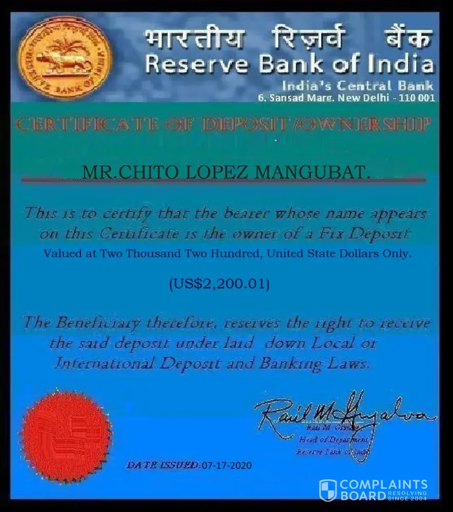 This message was sent from the accounts department of reserve bank of india. it is only designated for intended recipient only. if you have received this email in error you should immediately discard it without transferring or storing any of it's content. anyone caught not abiding with these rules will be made to face the law as all communications are officially meant for reserve bank of india customers only.