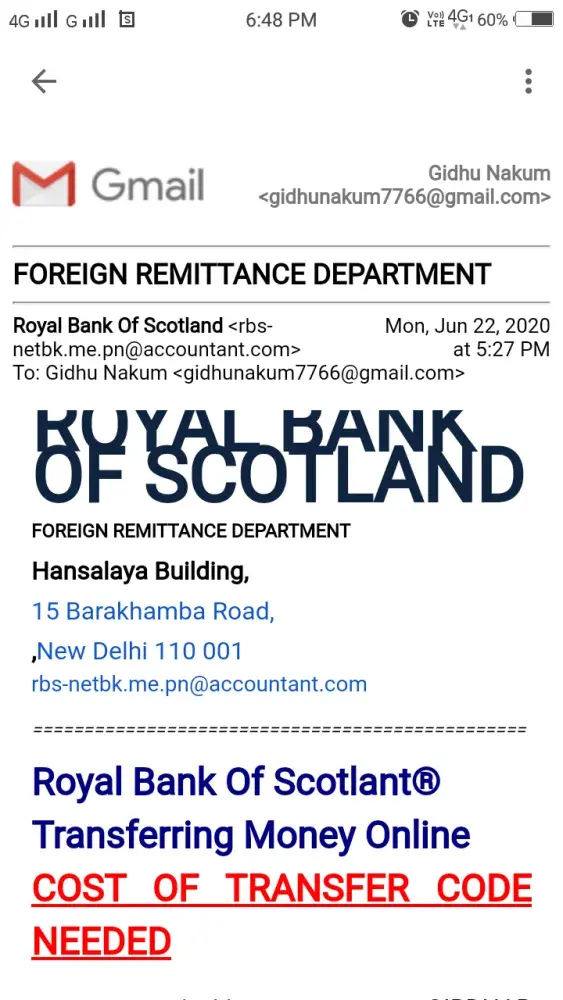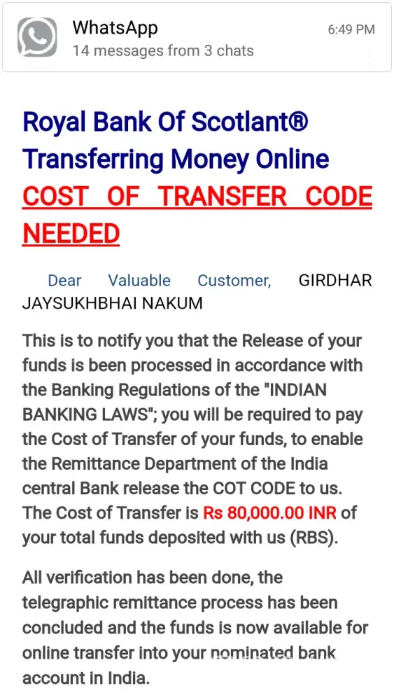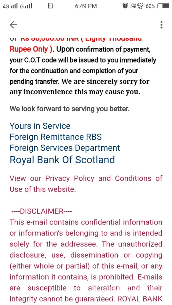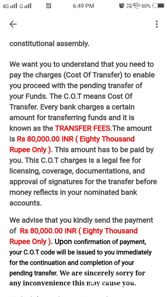 I have received an email from RBI about my transfer of funds from the email ID admin5@login-rbi.net and they are asking for 1, 65, 200 Indian rupees for the COT code I need for transfer if my funds. Is it true or a scam? If is it true, can u guarantee me that I will receive my funds after I pay for the COT code . Will I have to pay again for any reason to get my funds transferred? So I request you to Please do help us with this and answer my questions as soon as possible. I have already paid the GST for it. So please do tell us about the money required for COT code. Urgent reply from you will be appreciated.