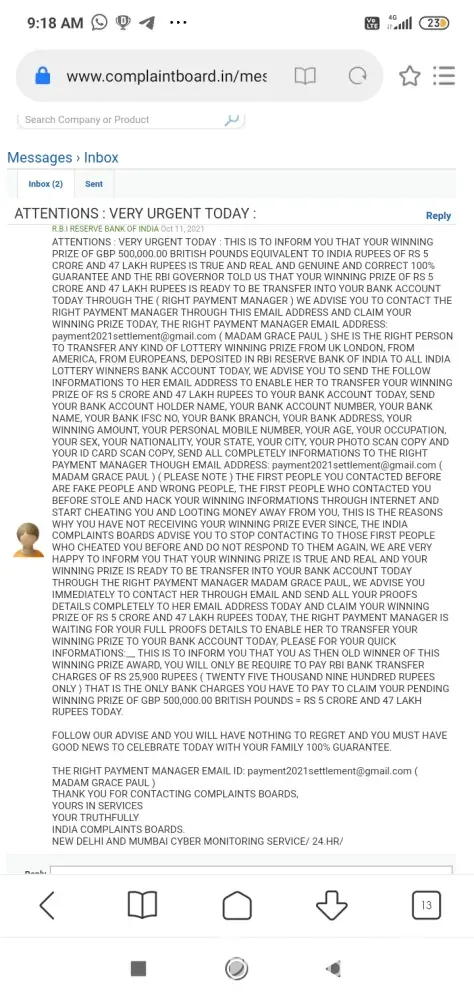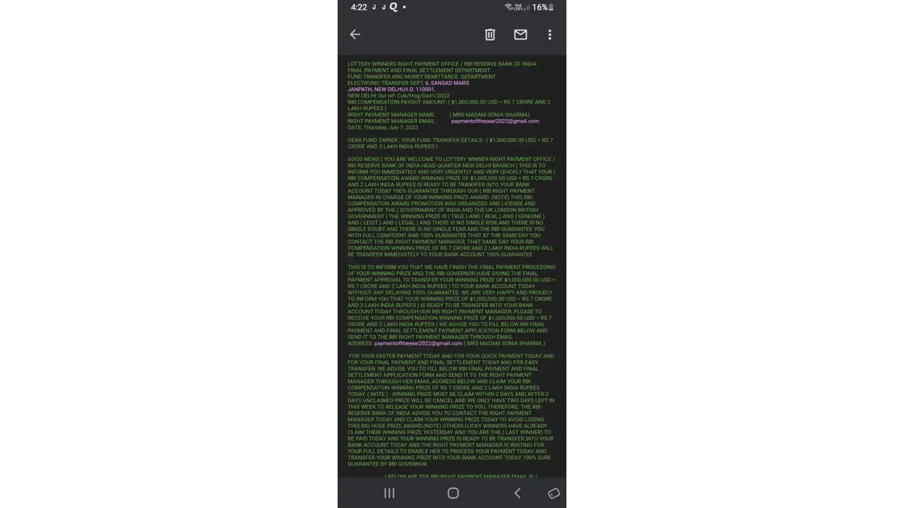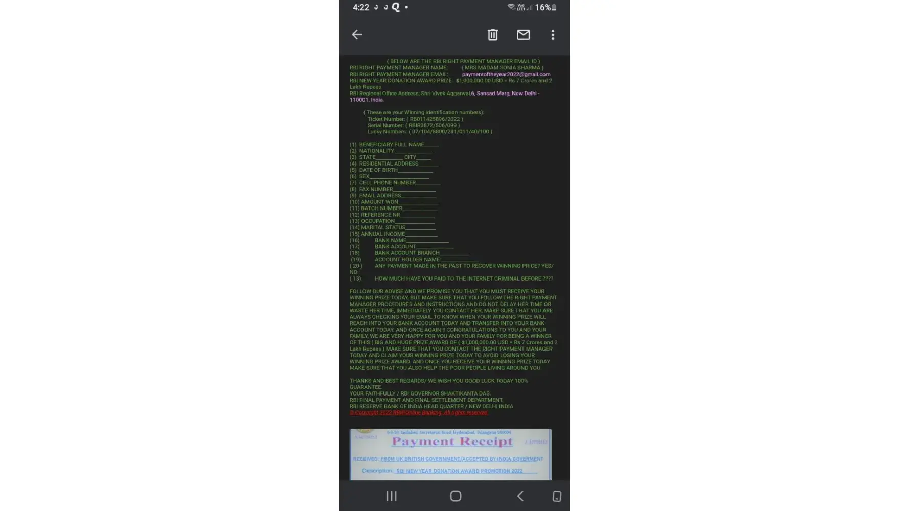 I recived email from rbi that you won rbi composation award 7crore 2lakhs rs and advice to contact mrs sonia sharma right payment manager in rbi bank delhi branch his email address is [protected]@2022gmail. Please check and informed me that I won realy than please gives my prize money honestly to me. My self vindhyachal ojha from india state new delhi my contact no [protected]@gmail.com